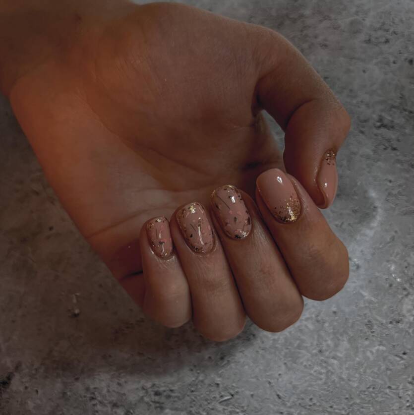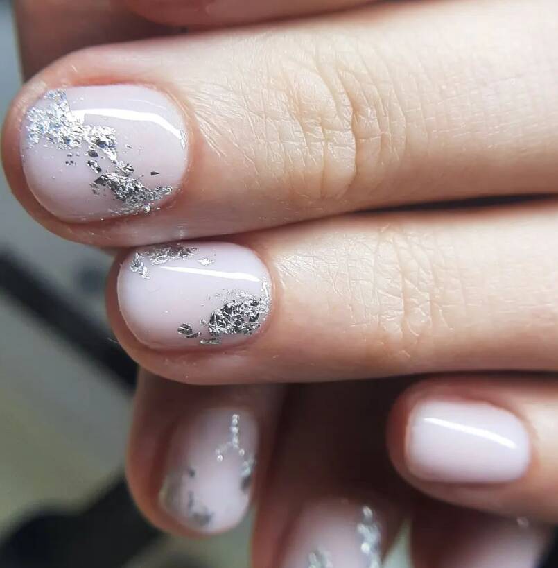 Маникюр с фольгой на коротких ногтях стал трендовым относительно недавно. Чаще всего он выглядит как покрытие с добавлением золота или серебра. Смотрится необычно и богато.