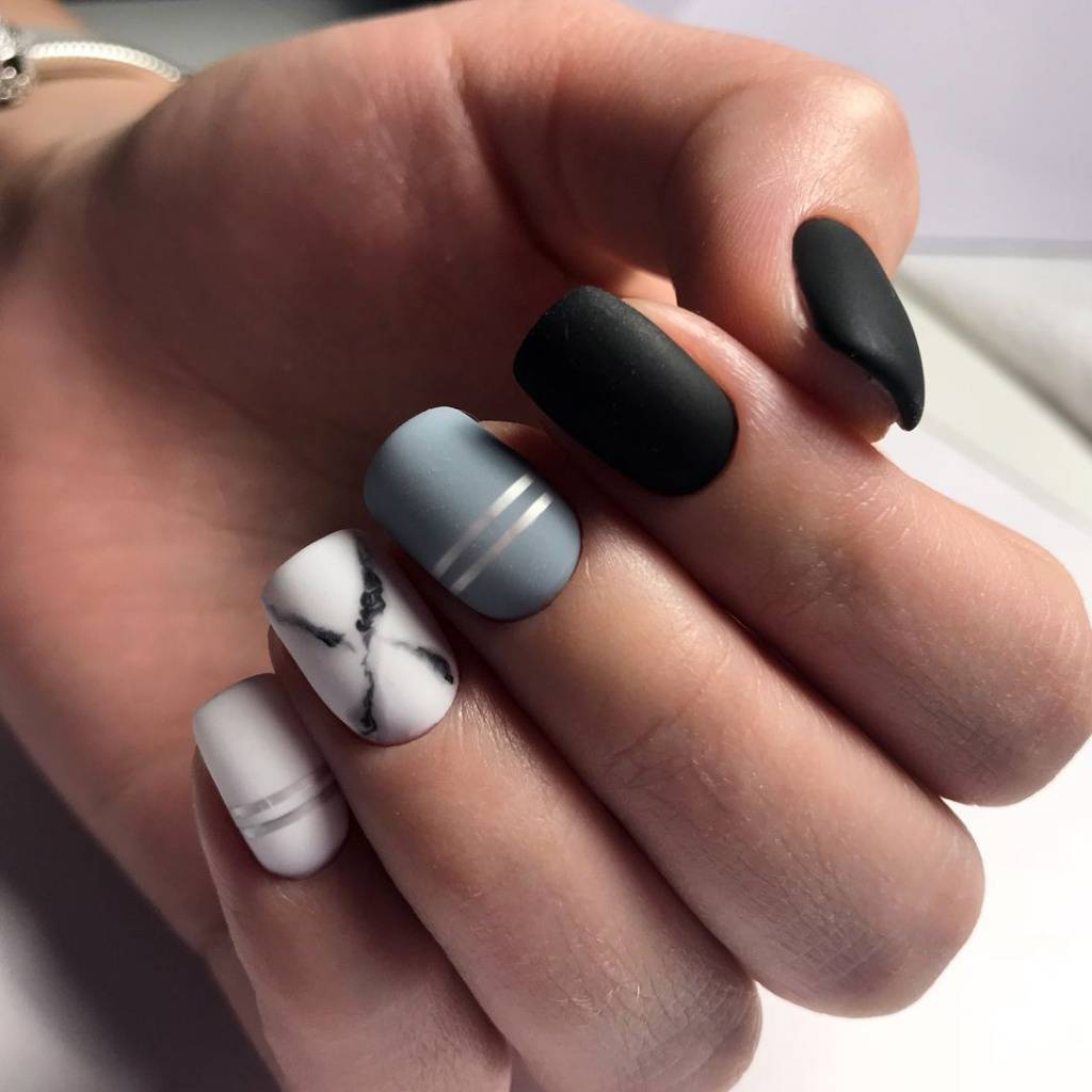 В трендах серого маникюра находится именно матовый маникюр. Матовый серый цвет смотрится стильно, минималистично и не вызывающе. Дополняют такой маникюр, обычно, геометрическими фигурами, сдержанными рисунками или линиями.