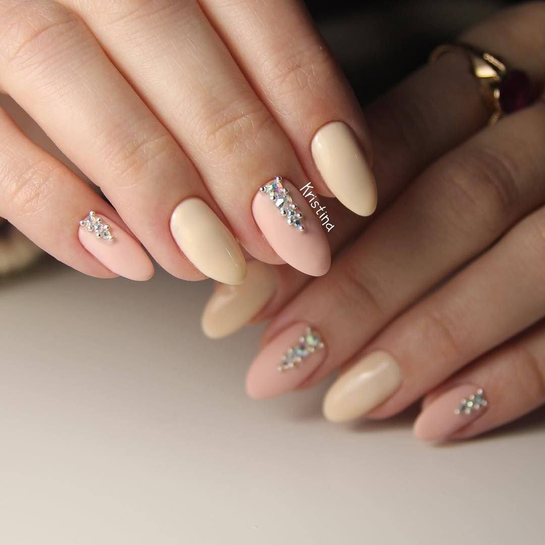 Куда же без этих украшений! С блесками и стразами бежевый маникюр смотрится ярко и эффектно. Но результат напрямую зависит от количества размещенных блесточек и страз. Чем больше их на ноготке, тем смелее можно утверждать, что маникюр претендует на звание праздничного.