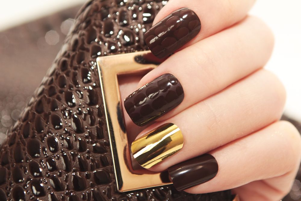 А вот для земляной стихии базовые оттенки должны быть насыщенными и не очень яркими. Например, шоколадный, бордовый, темно-синий, темно-зеленый, коричневый. Хорошо их сочетать с белым. Лучше всего такой маникюр делать на короткие ногти.