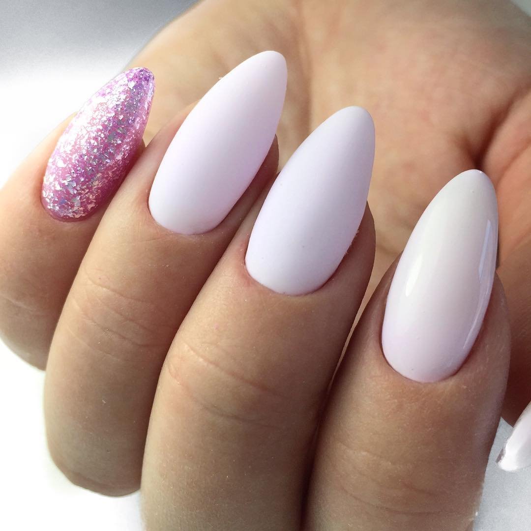 Заостренная овальная форма хорошо смотрится на ногтях средней длины и внешне удлиняет пальцы.