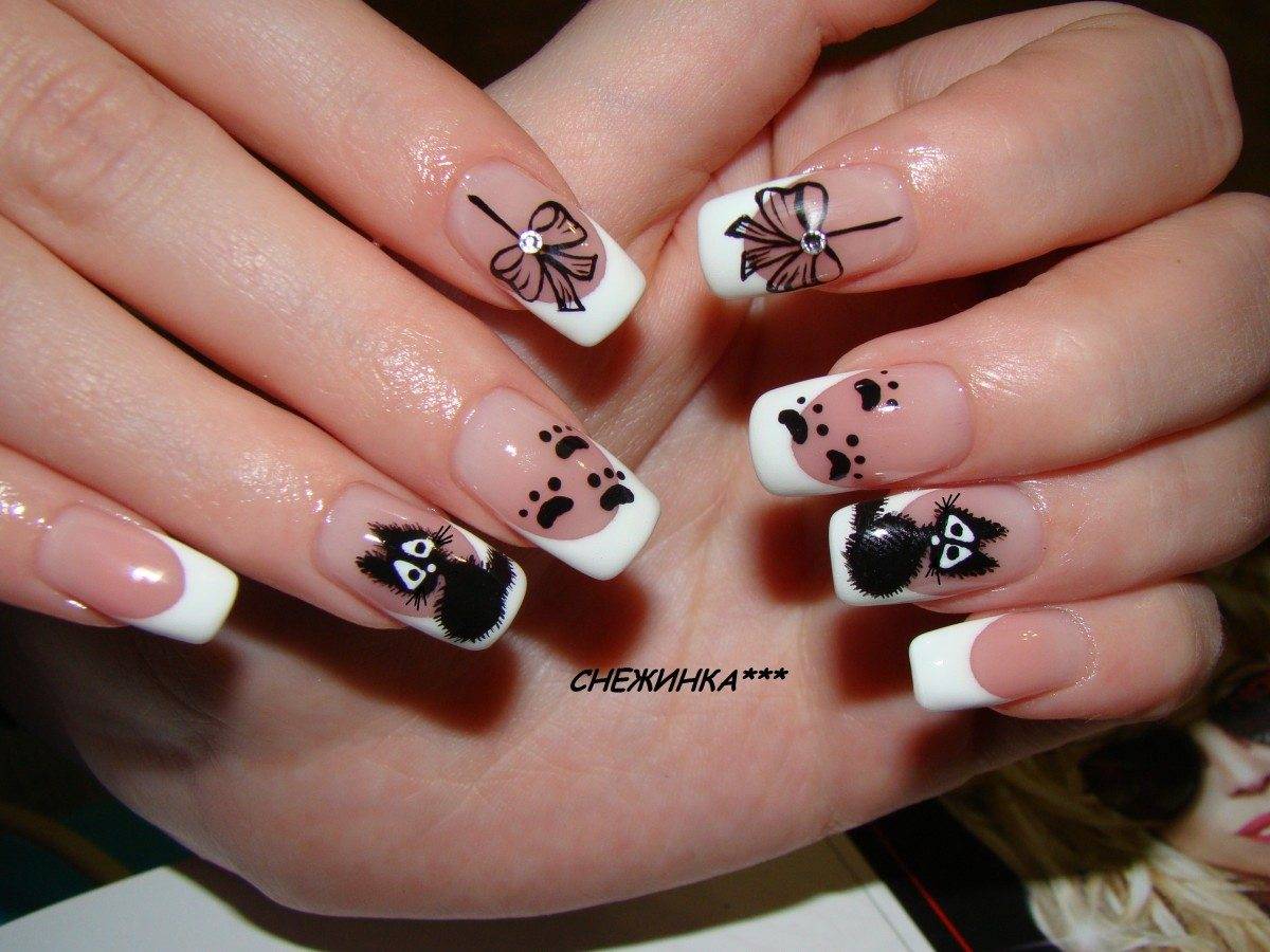 Возможно, вы даже и не знали, а кошачьим узором можно дополнить французский маникюр. Выглядит это эффектно и оригинально. Делается дизайн «Кошки» следующим способом: