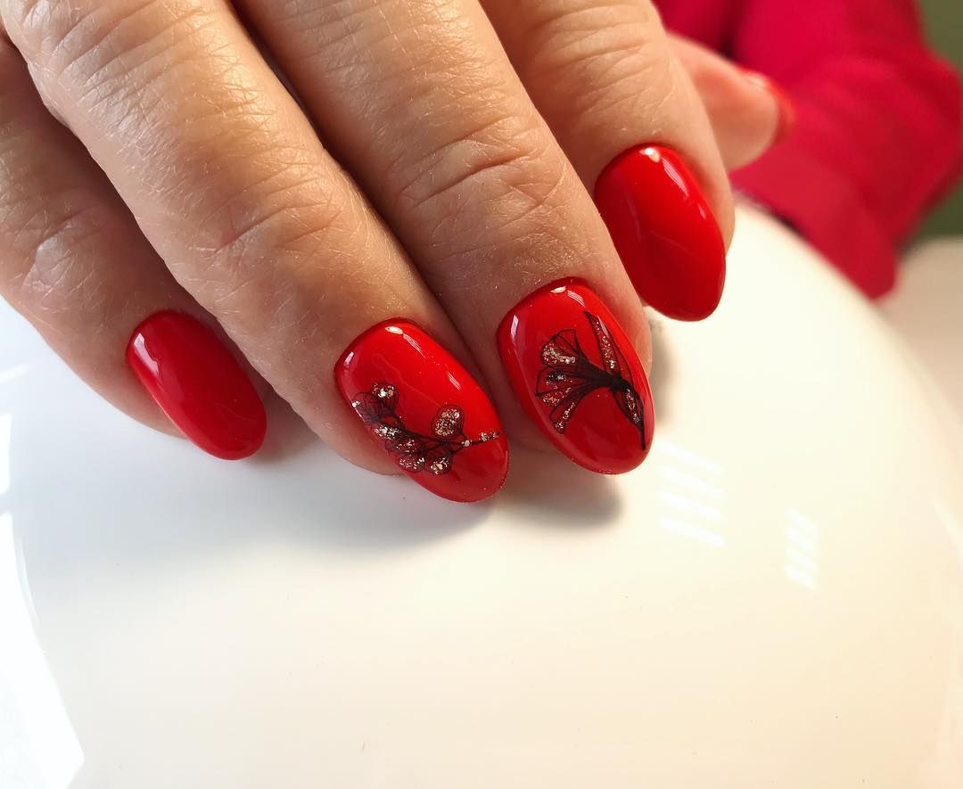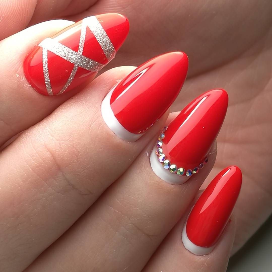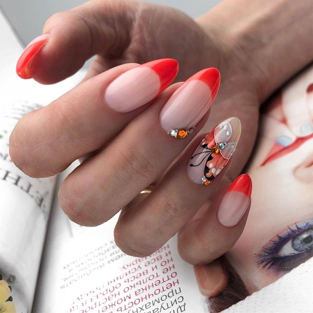 Любой оттенок красной палитры — это страсть и яркость. Если дополнить такой маникюр сверкающим декором, вы абсолютно точно будете в центре внимания. Чтобы френч был более эффектным, выбирайте матовую красную текстуру. Это поможет немного усмирить интенсив красного.