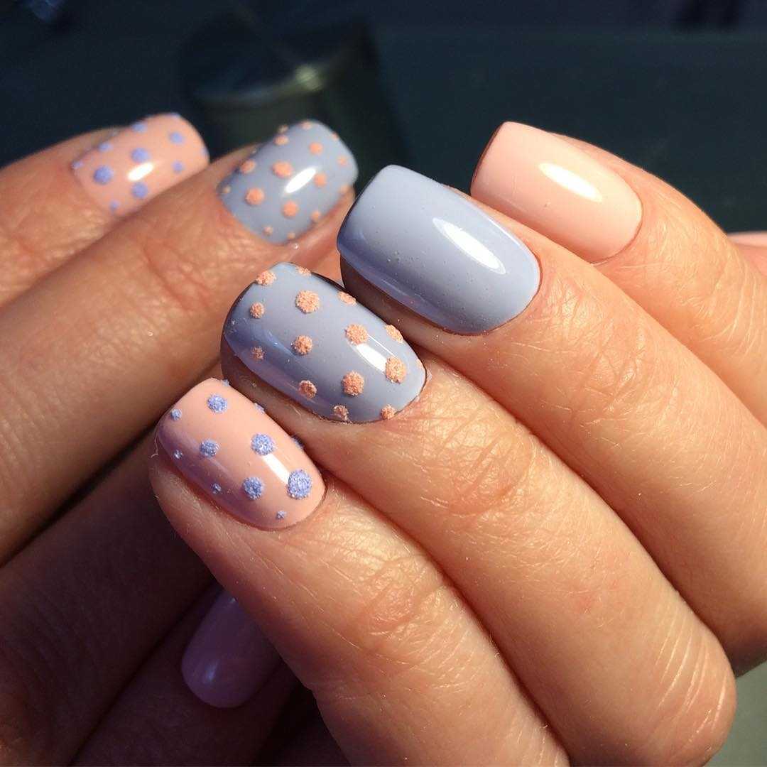 Удивительно сочетается розовый лак с синим сияющим «горошком». Этот дизайн ногтей с блёстками прекрасно смотрится на коротких ногтях.
