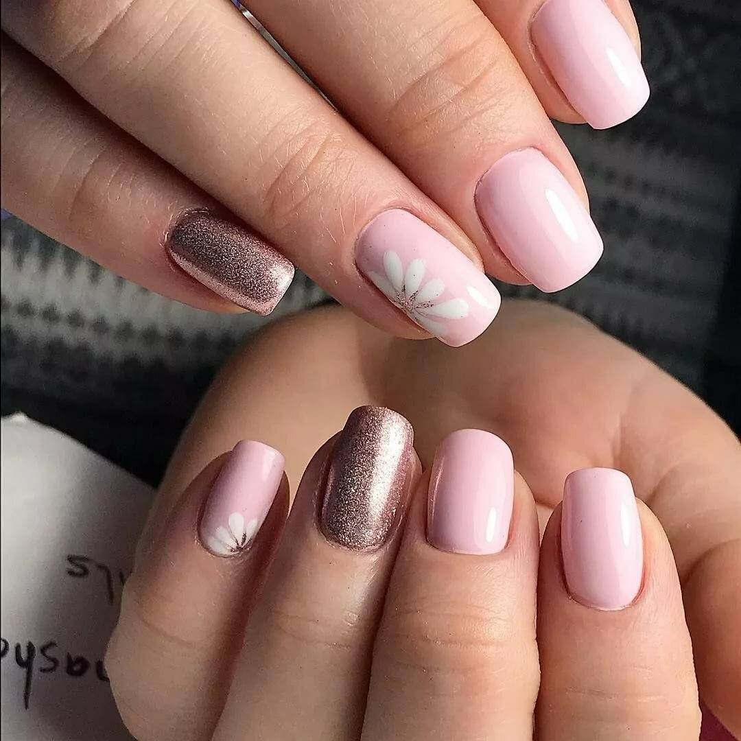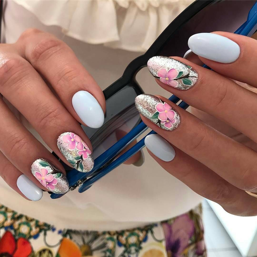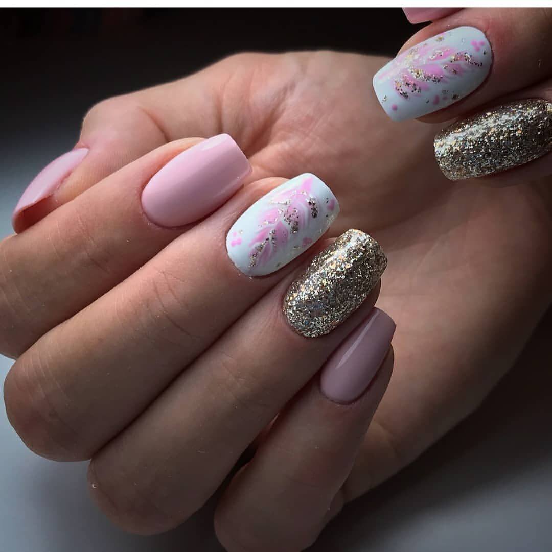 Светлый маникюр с блестками и рисунком
