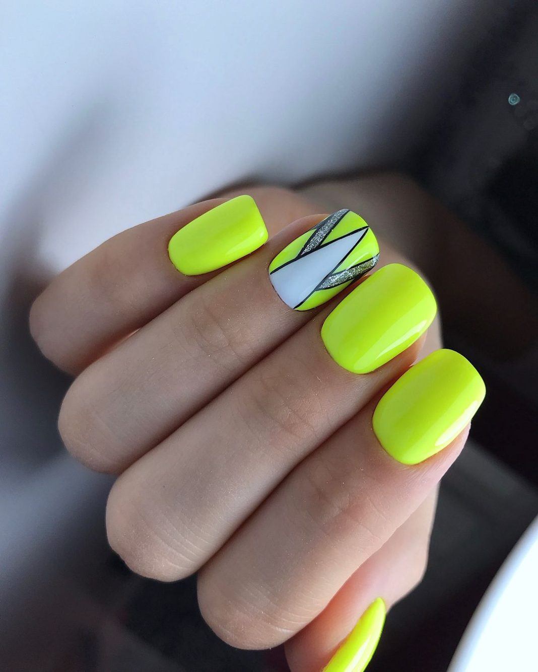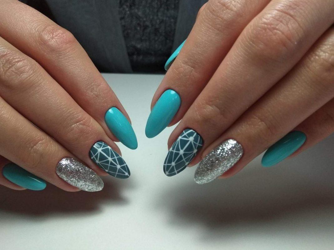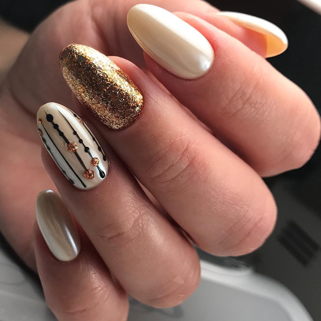 Геометрические узоры предоставляют модницам прекрасную возможность при каждом оформлении маникюра создавать всё новые и новые потрясающие идеи нейл-дизайна. Блёстки в этом случае только подчёркивают изысканность маникюра. На светлых ноготках очень красиво смотрятся всевозможные полоски, зигзаги и волны, которые могут выполняться как другими оттенками лаков, так и самими блёстками
