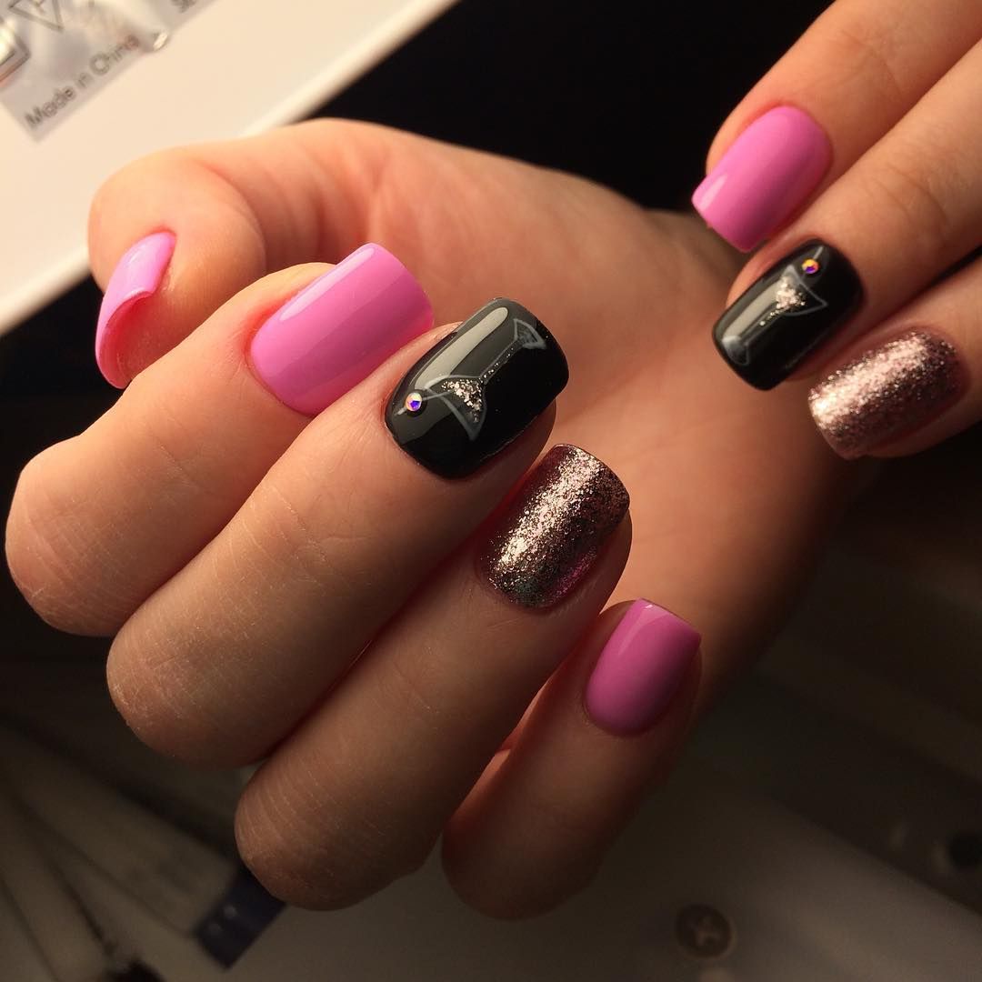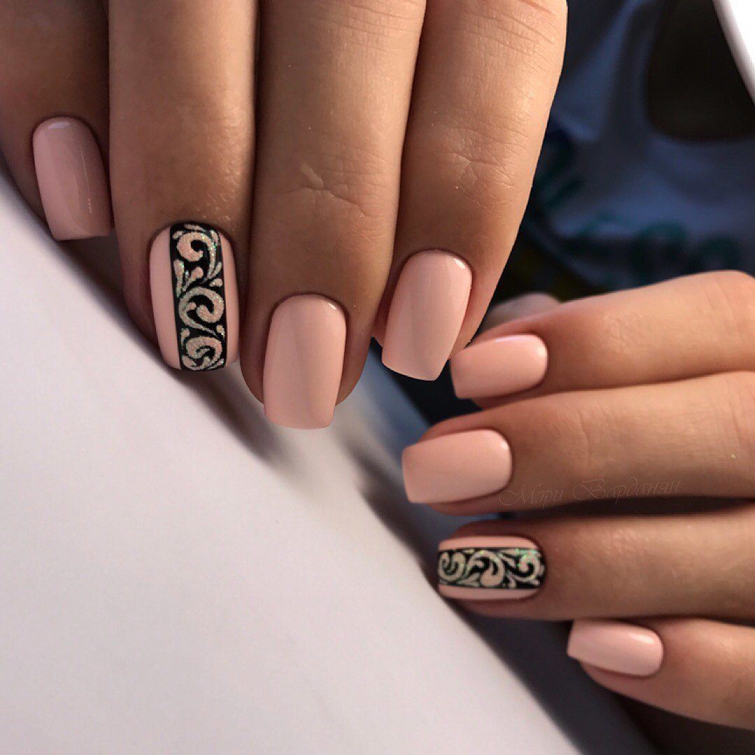 Выразительным станет нейл-арт в светло-розовом оттенке, если на одном из пальцев нарисовать черную вертикальную линию и сверху ее покрыть глиттером.
