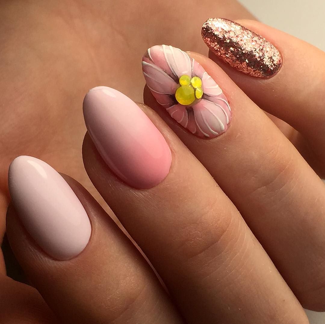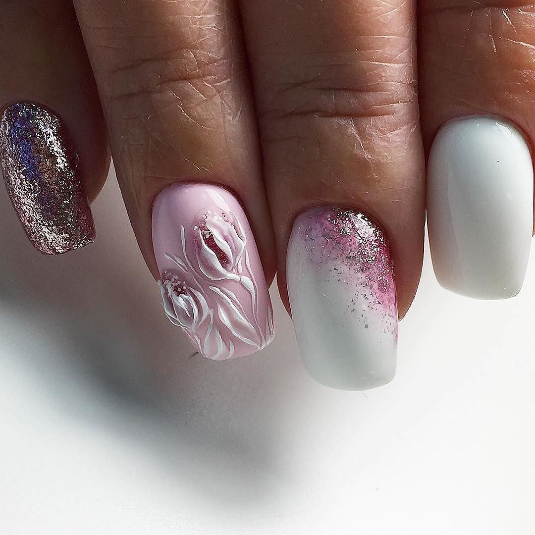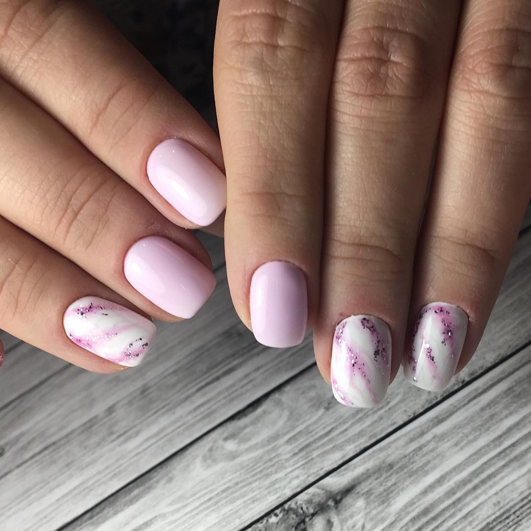 Трендовым сочетанием гель-лака и блесток будут оттенки, приближенные к натуральным, из пастельной палитры, в частности прозрачные, бежевые, розовые и белые тона.