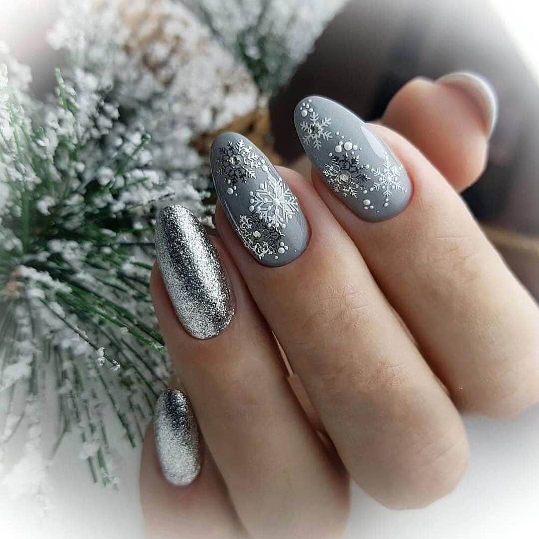 А нежные снежинки обрамленные блестками создадут еще более женственный образ, придав ему сказочную загадочность. Особенно актуальным блестящий зимний маникюр с тематическими рисунками станет во время новогодних праздников и прочих торжественных зимних мероприятий.