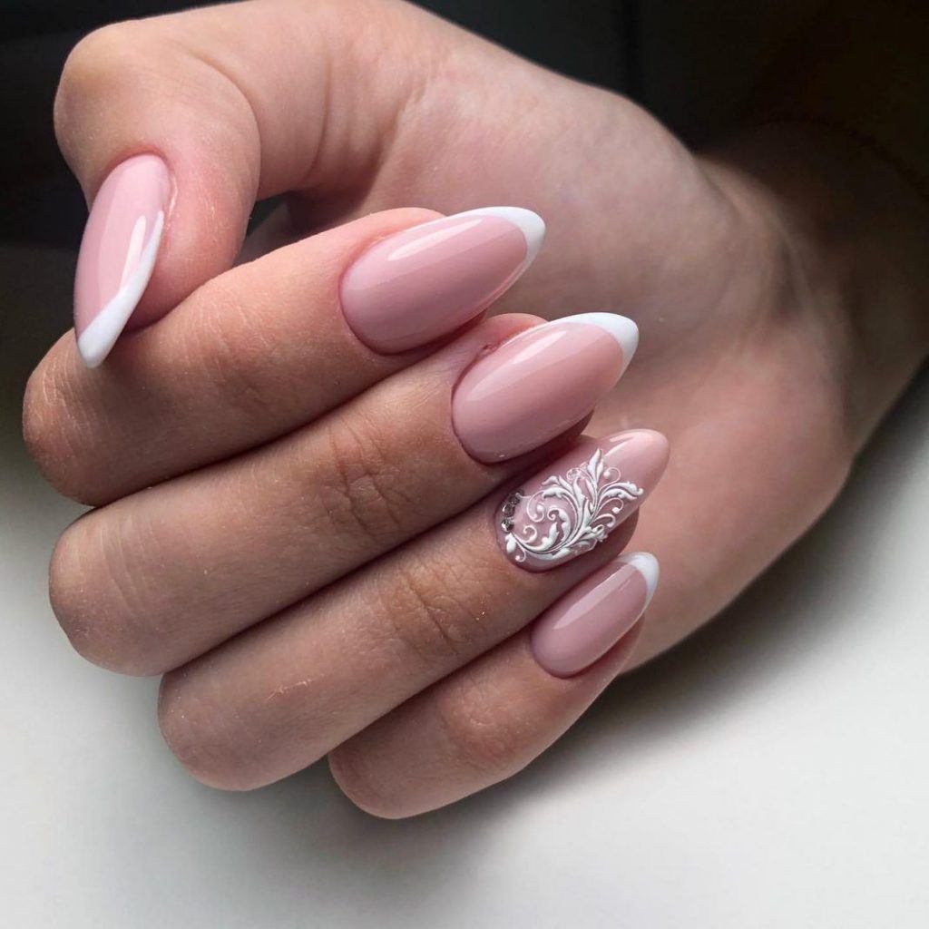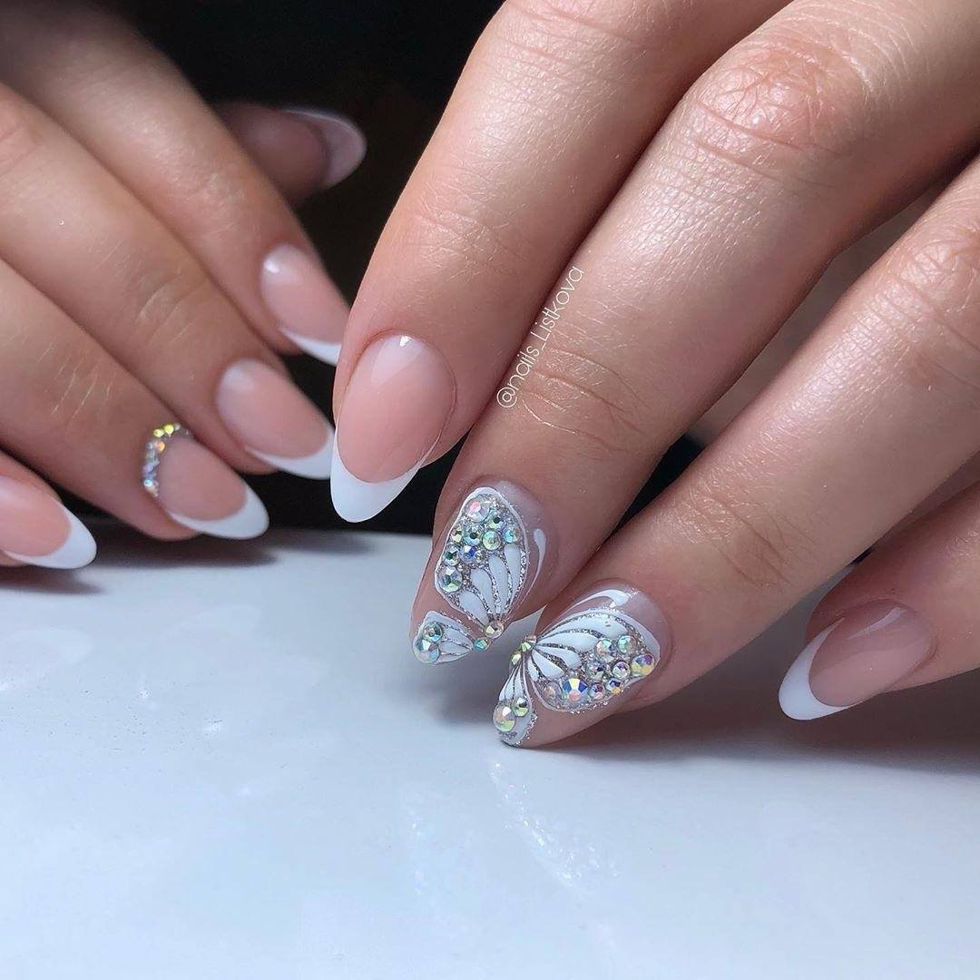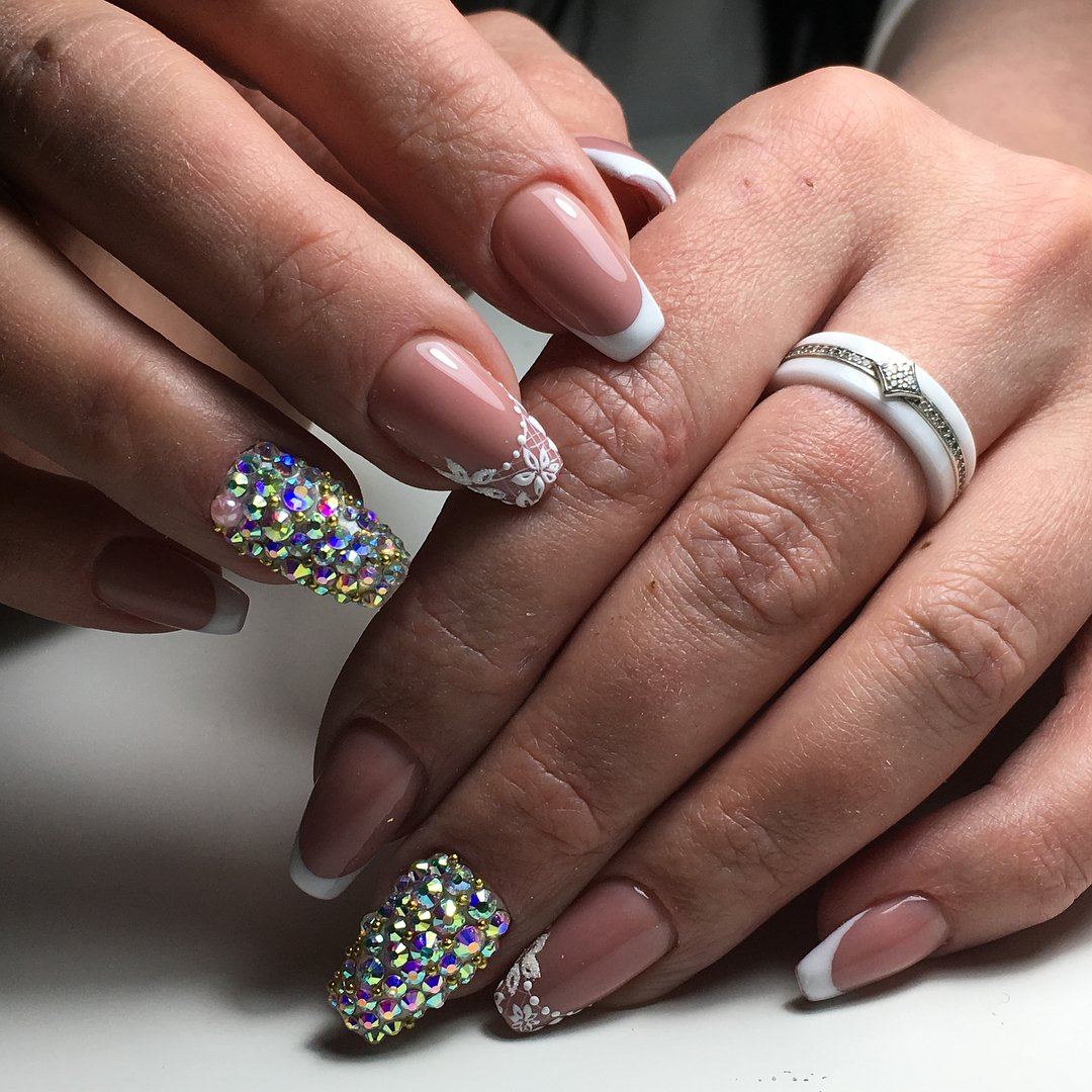 - Идеальный маникюр для невесты. Зачастую наращивание искусственных кончиков – это выбор невест. На поверхности смоделированных гелем или акрилом ногтей можно создать неимоверно нежный и очаровательный нейл-арт, усыпанный блестками. Гелевые ногти с классическим френчем – прекрасная площадка для экспериментов с маникюром. Стразы прозрачного или пастельного оттенка отлично сочетаются с белоснежной линией улыбки. Посмотрите на фото, и вы увидите, каким элегантным и романтичным может быть свадебный нейл-арт, украшенный стразами.