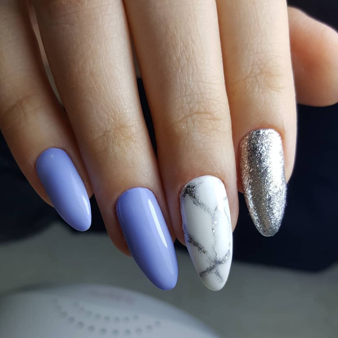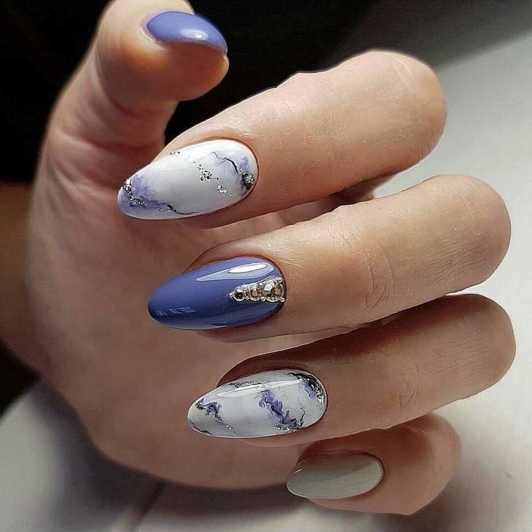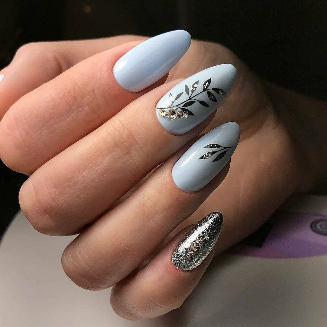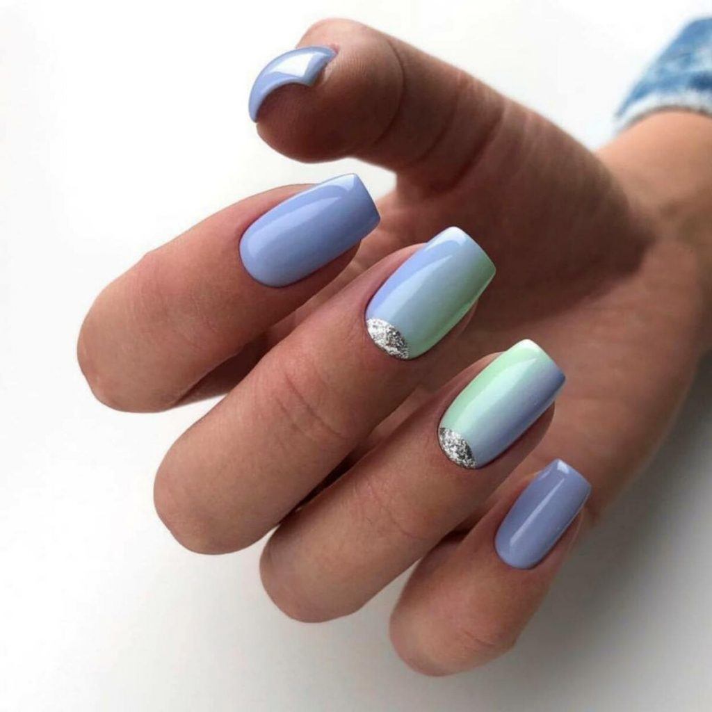 Благородные оттенки синего — это классика маникюра. Они подходят под любой стиль в одежде. При выборе оттенка глиттера ориентируйтесь на основной тон базового лака. не стоит выбирать слишком контрастные цвета.
