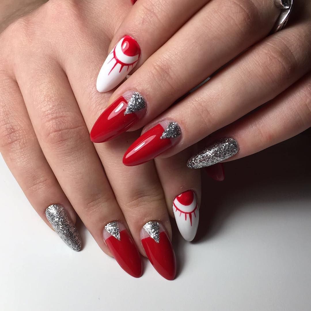 С помощью кисточки нарисуйте лаком с серебряными блестками треугольники на лунках ногтей. Таким образом лучше выделить не один ноготь на каждой руке.