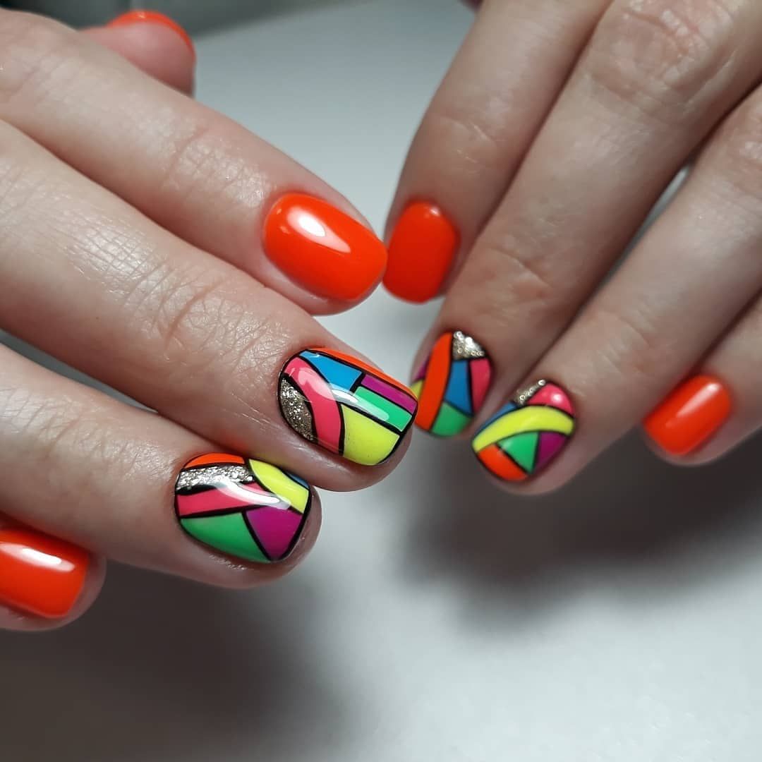 Особое внимание мы рекомендуем обратить на эффектные композиции из мелких геометрических фигур, которые напоминают собой узоры в силе «колор блок». Вместо ярких лаков в этом случае используются сверкающие частицы, которые полностью заполняют некоторые детали изображения