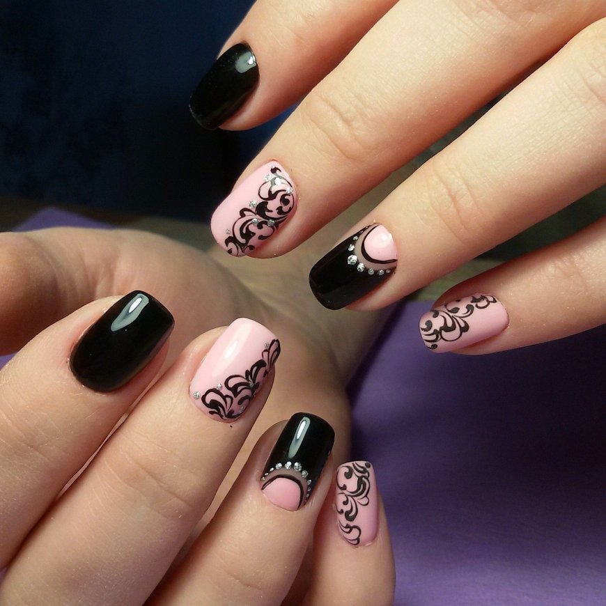 Еще несколько лет назад ассоциировался с эмо культурой. Сейчас же его воспринимают, как яркий, эффектный вариант для гламурных обольстительниц. Любительницы минимализма могут выбрать технику «френч». Это может быть французский маникюр выполненный в черно-розовом цвете или лунный маникюр. Розовый цвет имеет множество оттенков. Попробуйте скомбинировать черное покрытие с нежным розовым цветом, приближенным к персиковому. Вы получите оригинальное и интересное сочетание.