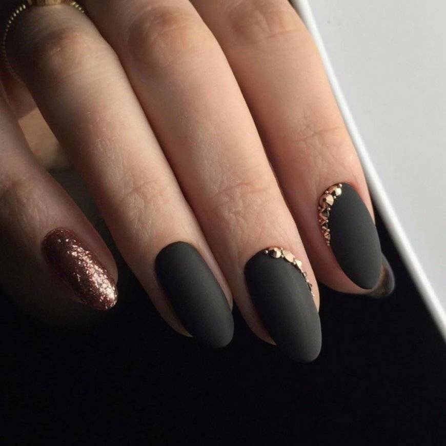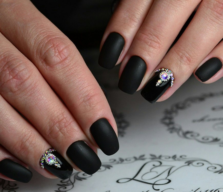 Черный матовый маникюр – это интересное и нестандартное решение оформления ногтей. Его можно разбавить каплями или стразами. Также такой вариант матового маникюра отлично смотрится с рисунками, с блестками.