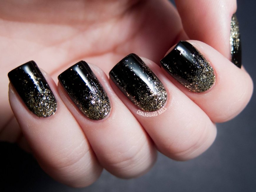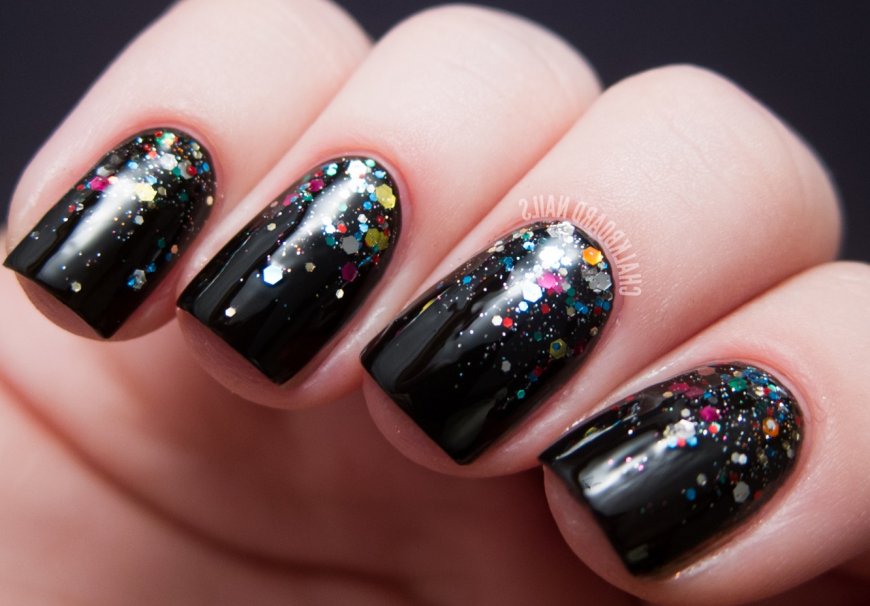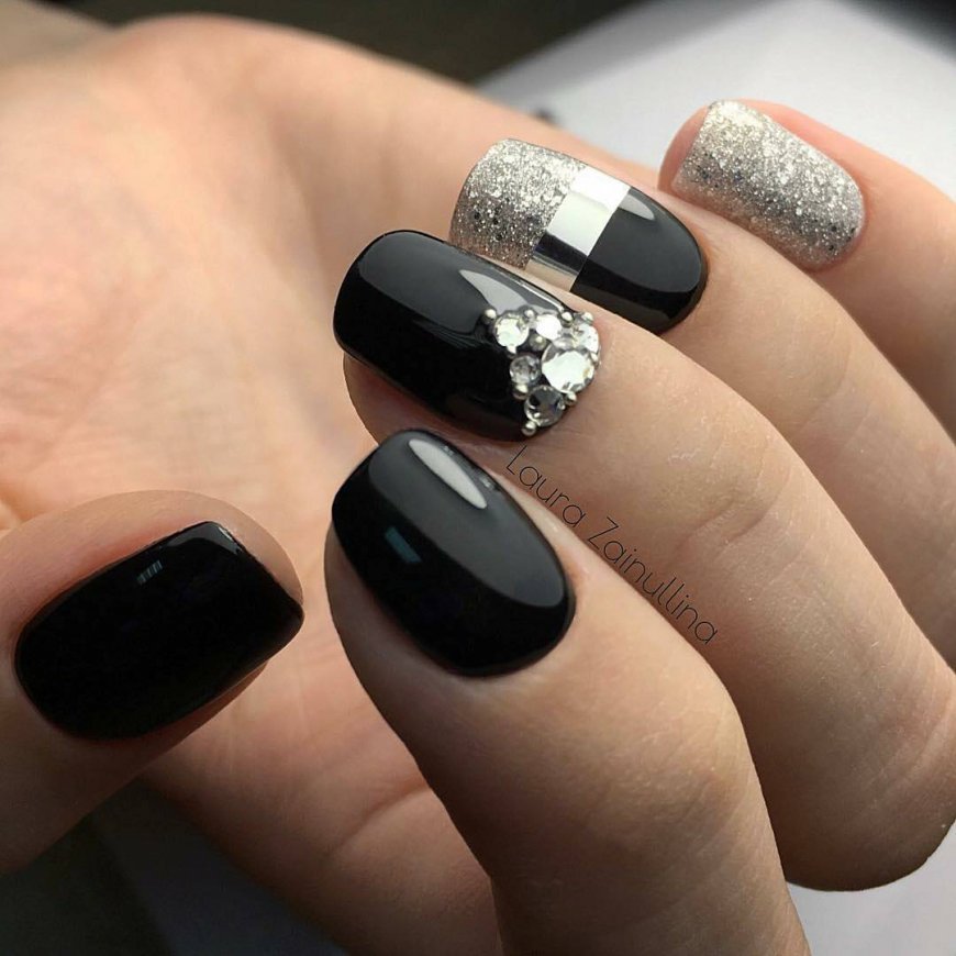 Различные блёстки всегда, великолепно смотрятся на чёрном фоне. Но не нужно перебарщивать украшая все ногти, изыскано будет смотреться маникюр с одним или двумя, украшенными ногтями на руке.