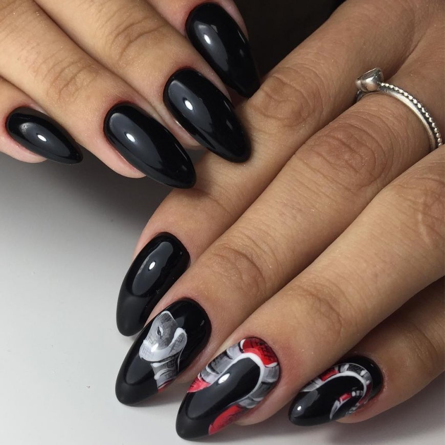 Варианты дизайна в черном маникюре могут быть самыми странными, броскими и уникальными. Выбрав лак для ногтей черного цвета, можно почти забыть о выборе оттенков, ведь с ним можно хорошо сочетать все тона. Это настоящая классика, которая хорошо подойдет под любой образ.