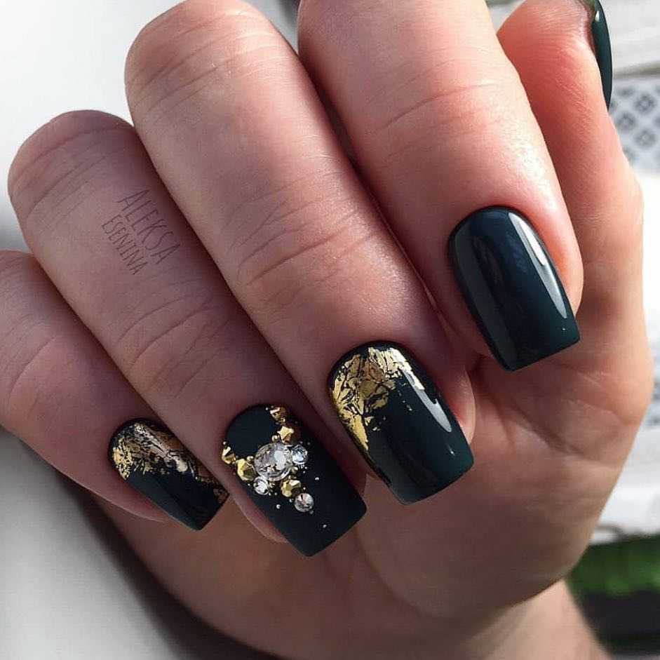- создайте новогоднийманикюр2019с фольгированными отпечатками и стразами, блестящие «островки» добавят нейл-арту блеска и шика;