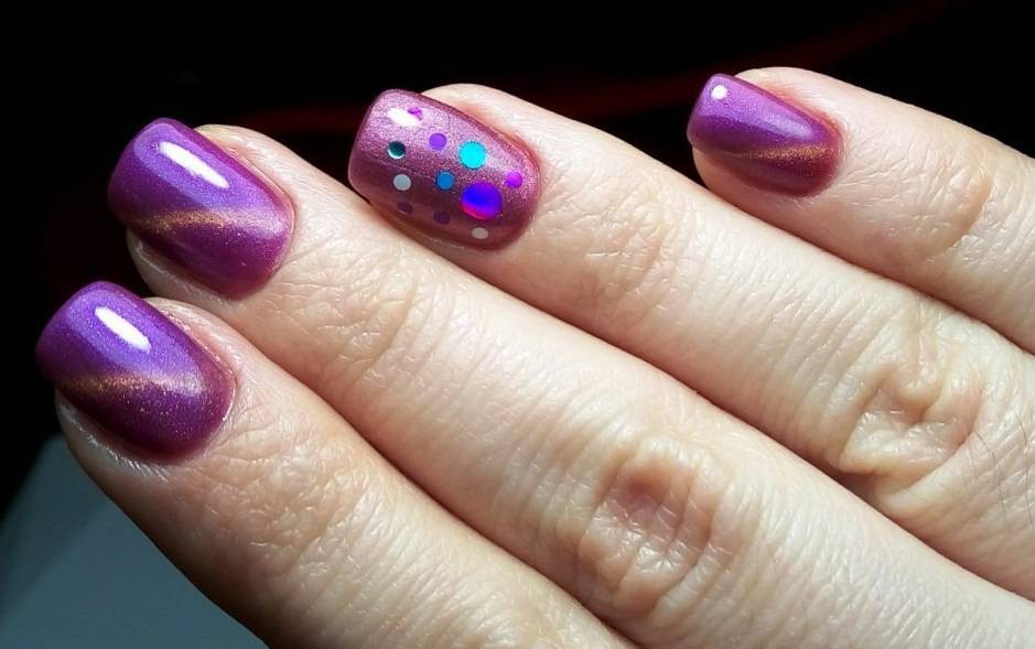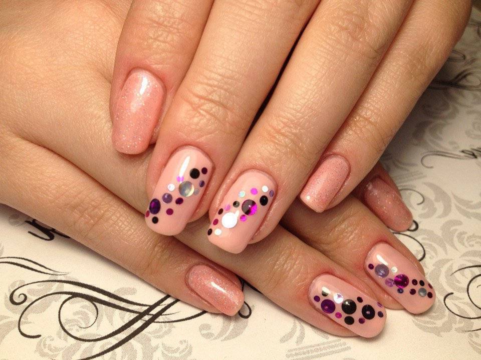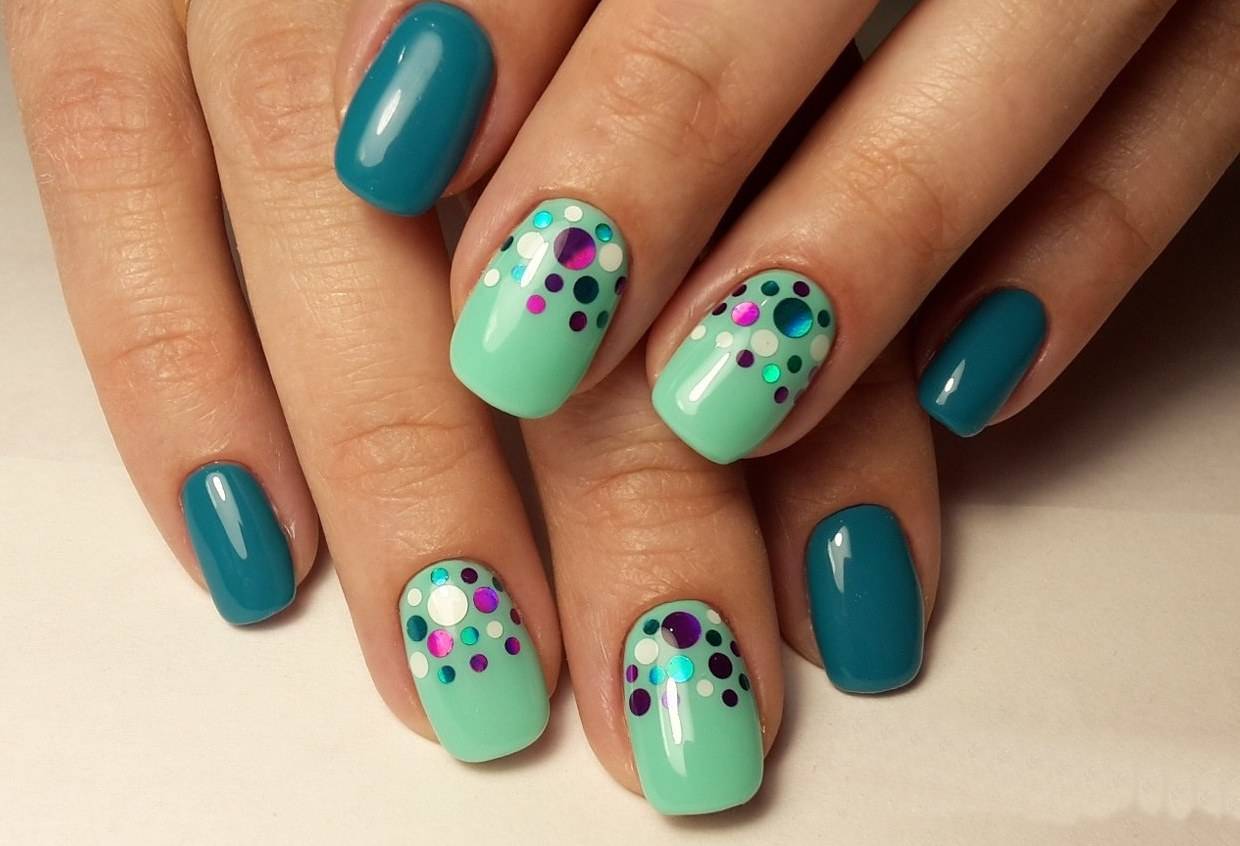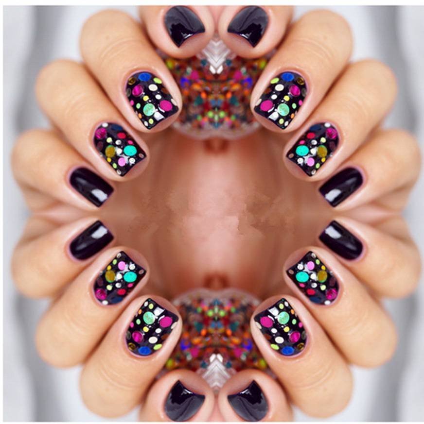 диско-style. Здесь яркие разноцветные кружочки на насыщенной базе напоминают осколки диско-шаров. Наиболее выгодно такое решение раскрывается на насыщенно-черном, изумрудном, персиковом фоне;