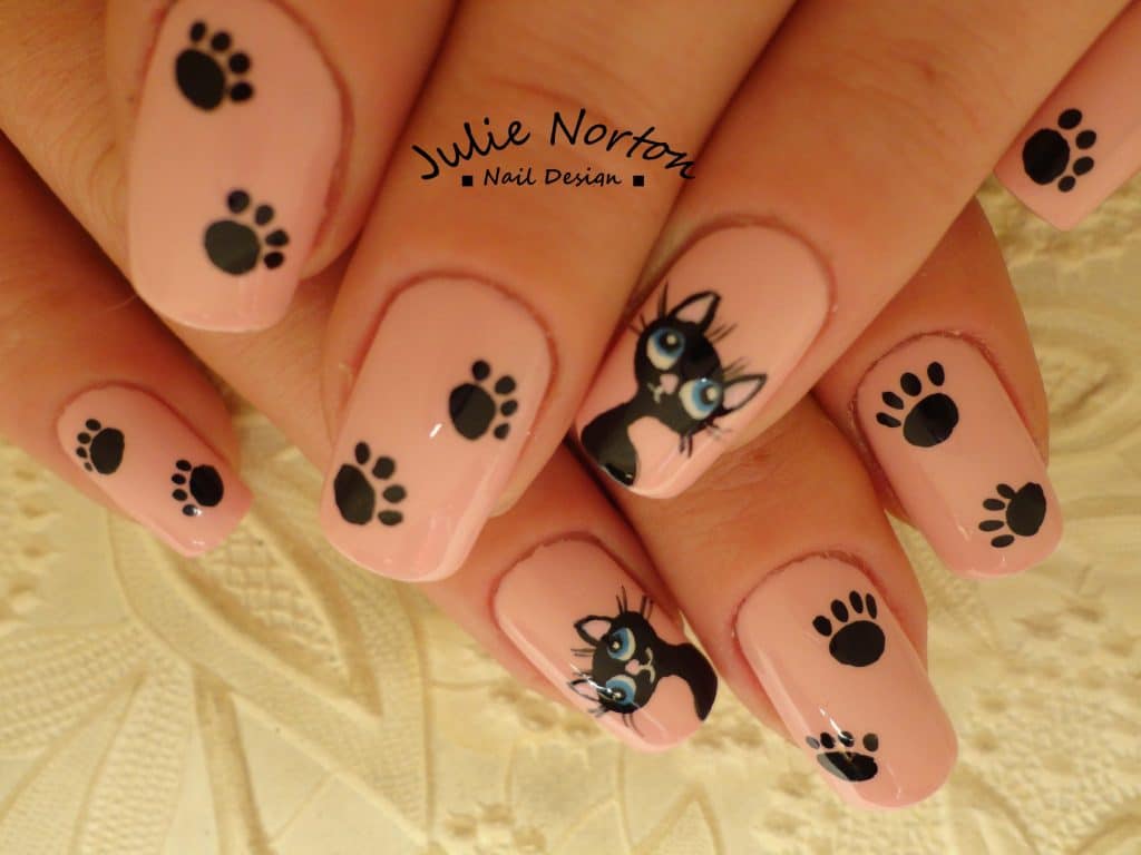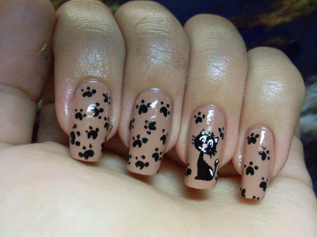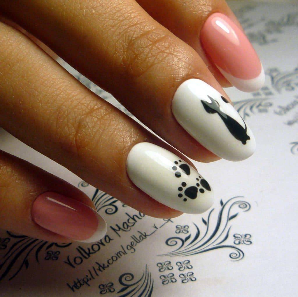 Маникюр с рисунком кошки и лапки