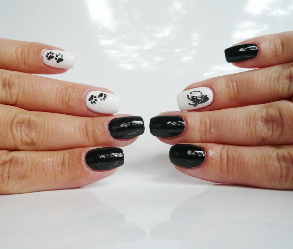 Очень красиво смотрится белый маникюр с изображением черной кошки