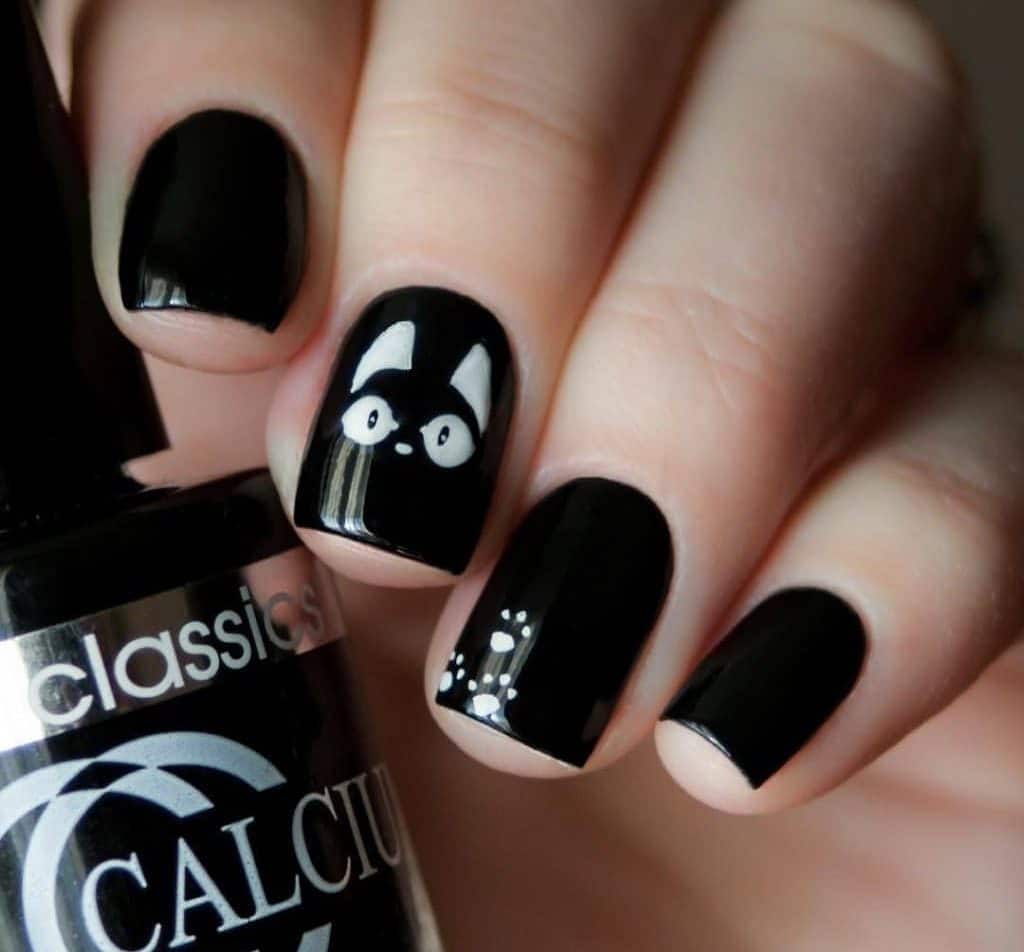 Еще одним вариантом кошачьего маникюра является маникюр с силуэтом кошки. Силуэт может быть нанесен на ноготь с помощью наклейки слайдера (так называемый слайдер дизайн), либо же нарисован вручную с помощью кисточки.