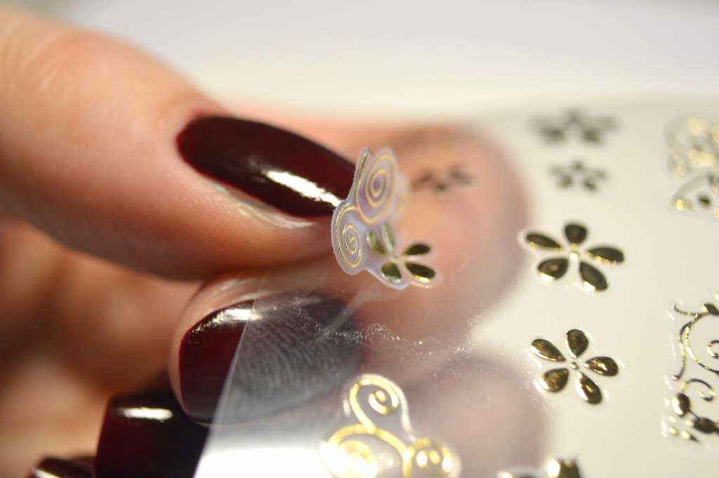Один из наиболее популярных видов наклеек, где внутренняя сторона покрыта клеем и отлично прилипает к основе, а на внешнюю сторону нанесен красивый узор. Перед приклеиванием следует подготовить ногтевую пластину и обозначить место для размещения наклейки. Потом отсоединить элемент декора от основы и липкой стороной приложить к ногтю.