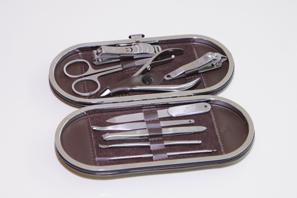 Стоит относительно недорого, а предметы, находящиеся в нем, только самые нужные. Набор создан специально для качественной обработки ноготков на руках. Все предметы надежно зафиксированы в футляре, его материал – натуральная кожа. Материал всех предметов в наборе – качественная и долговечная медицинская сталь. В наборе вы найдете щипцы и ножнички для кутикулы, удобный пинцет с пушером.