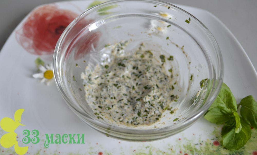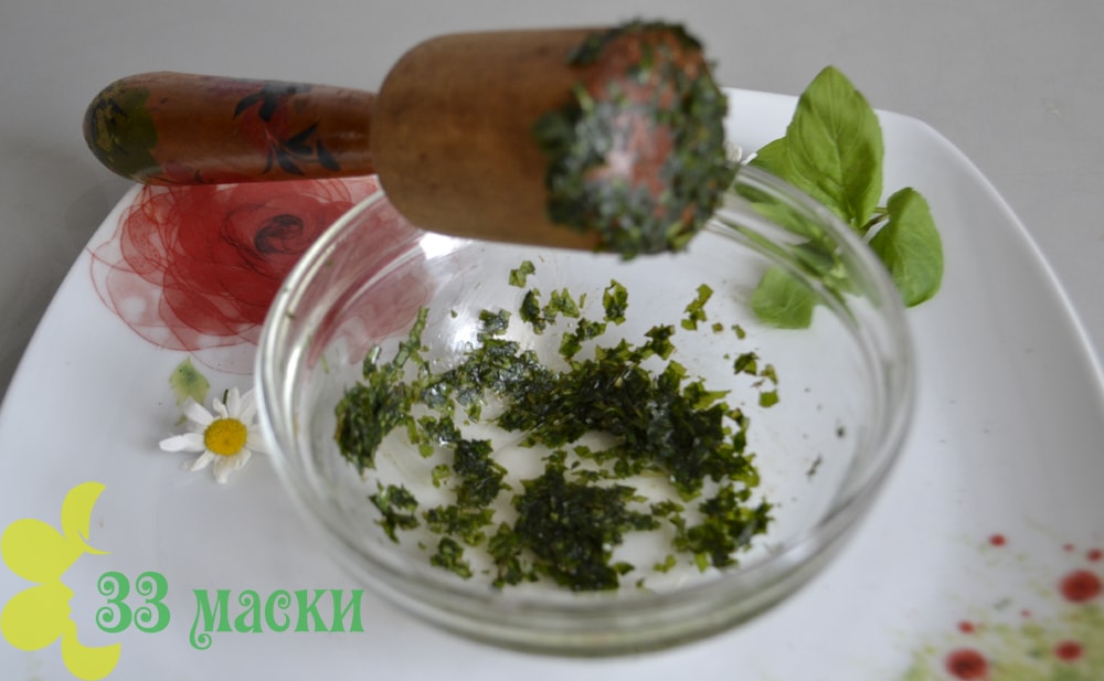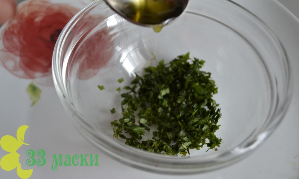 Измельчить мяту ножом и размять в керамической или стеклянной емкости вместе с оливковым маслом.