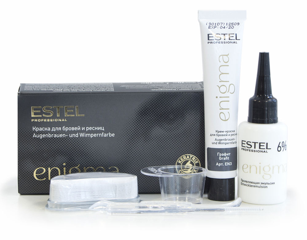 Бренд Estel давно приглянулся отечественным красавицам. Производитель выпускает качественный товар профессионального уровня по доступной цене. Estel Enigma относится к серии гипоаллергенных красок с натуральными природными оттенками. Комплектация у краски богатая – здесь вы найдете не только оксид, но и удобную щеточку для нанесения, и емкость для разведения красящих компонентов. Вымешиваются компоненты легко, спустя пять минут краска из жемчужно-белой превращается в –темно-коричневую или черную (в зависимости от выбранного оттенка).