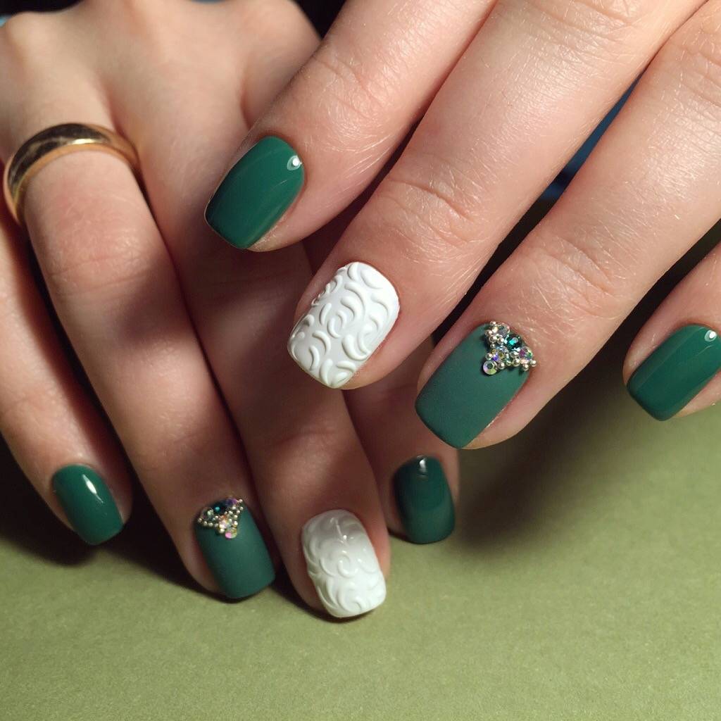 Классический и универсальный беж превосходен в сочетании с темно-зелеными и болотными оттенками. Матовое исполнение – более спокойный и повседневный вариант, глянец же выглядит более празднично. Разнообразить подобный дуэт способны узоры, стразы или блестки на бежевом фоне.