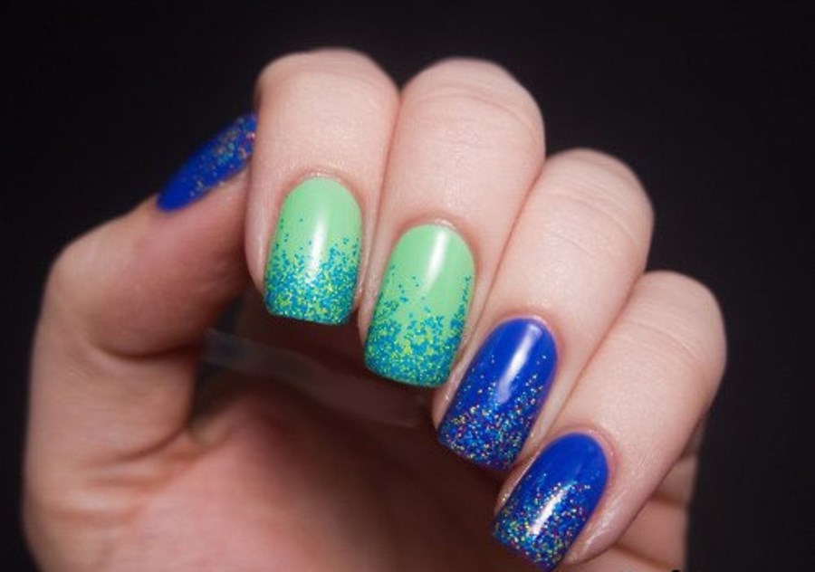 Уникальный двухцветный маникюр можно создать, выполняя градиент. Осуществить его можно по-разному — окрашивая каждый палец в разные тона, следуя от светлого к темному, или выполнить градиент на каждом ногте. Для этого используется губка, из которой вырезается прямоугольник размером 3х3 см. На гладкой рабочей поверхности нужно создать растяжку из двух оттенков — мятного и сочетаемого с ним (розовый, синий, белый, черный, серый). В полученную смесь обмакивается губка и лак отпечатком переносится на ноготь. Таким образом создается весь маникюр.