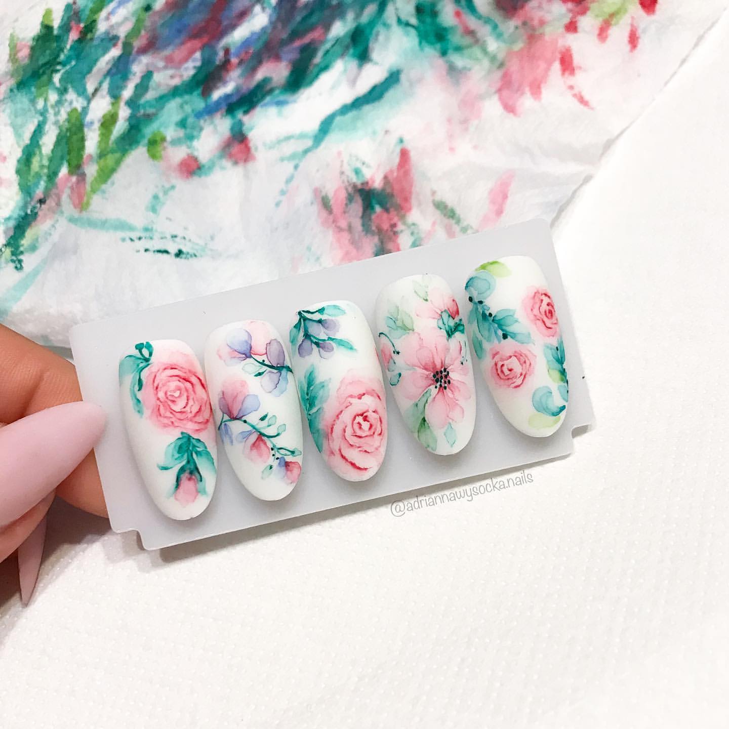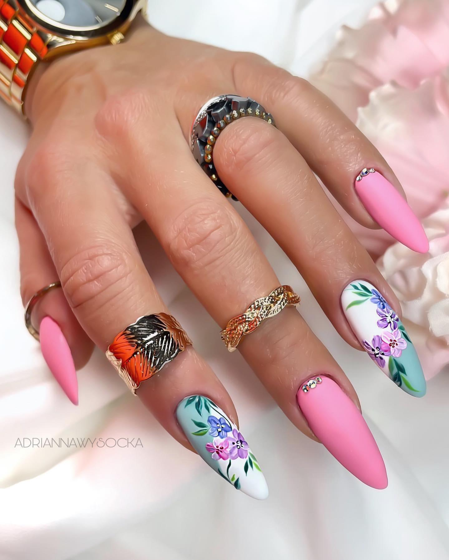 Цветочный нейл-арт освежает и оживляет образ. Сочетание мятной расцветки с другими пастельными тонами украсит общую картину.