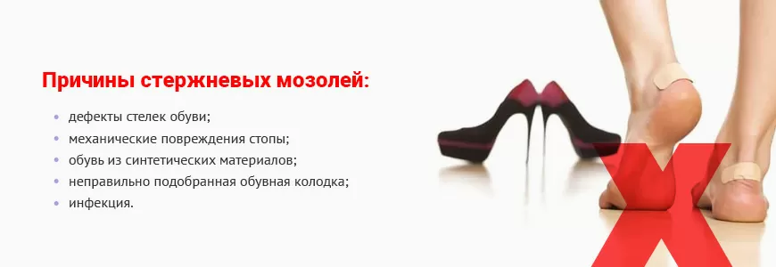 Обувь с плоской подошвой или высокими каблуками часто становится причиной появления стержневых мозолей.