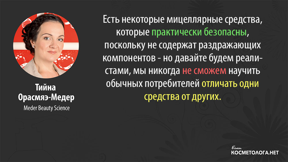 Тийна Орасмяэ-Медер: Принцип мицеллярного очищения по определению более щадящий, чем традиционно используемое омыление жиров, которое всегда приводит к нарушению барьерной функции кожи. Однако, даже вещества, используемые для создания мицеллярных средств, в большинстве случаев не абсолютно нейтральны.