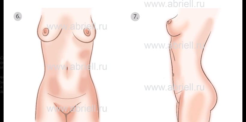 Главными критериями идеального живота является эластичная поверхность брюшной части с мягкими очертаниями, выступающими ниже пупка и впадающими выше него, небольшая протяженность между крайними частями прямых мышц подобная бороздке, с плотными паховыми и боковыми областями поверхности живота, создающие плавное очертание талии.