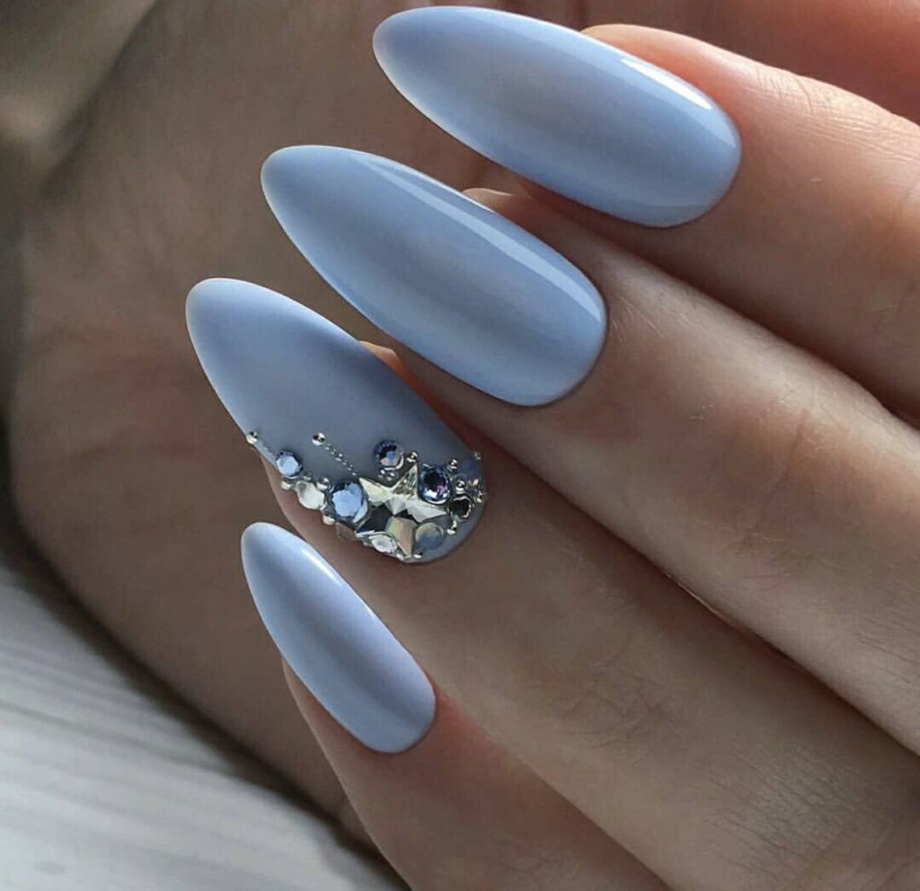 Декор со стразами на миндалевидных ногтях