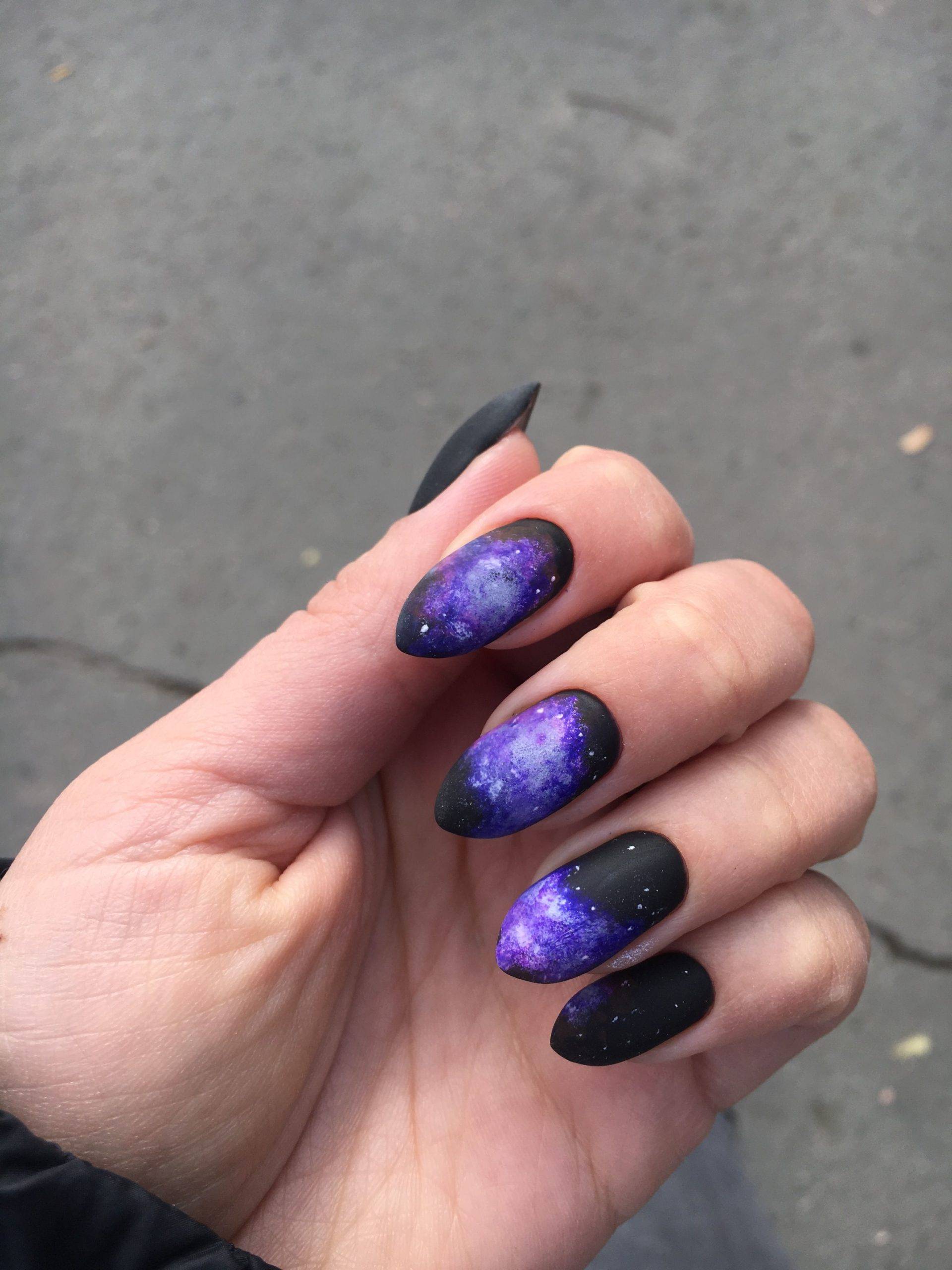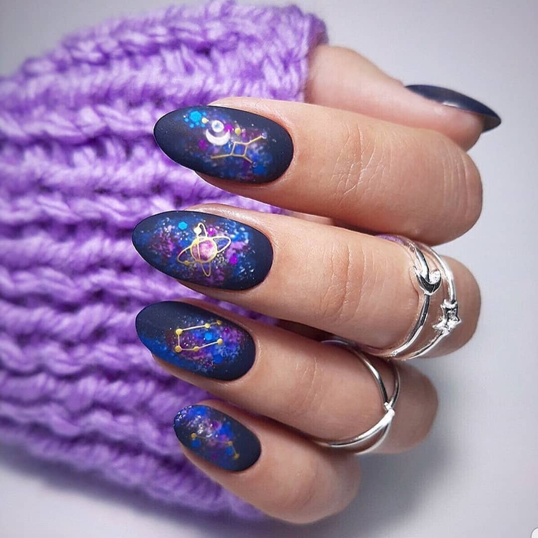 Непревзойдённого сияния можно добиться с эффектом космоса. Очень популярно изображать огромную вселенную с множеством планет или можно нарисовать млечный путь, комету, звезды. Маникюр придает изюминку каждому образу. Он подчеркнет женственность и романтичность.