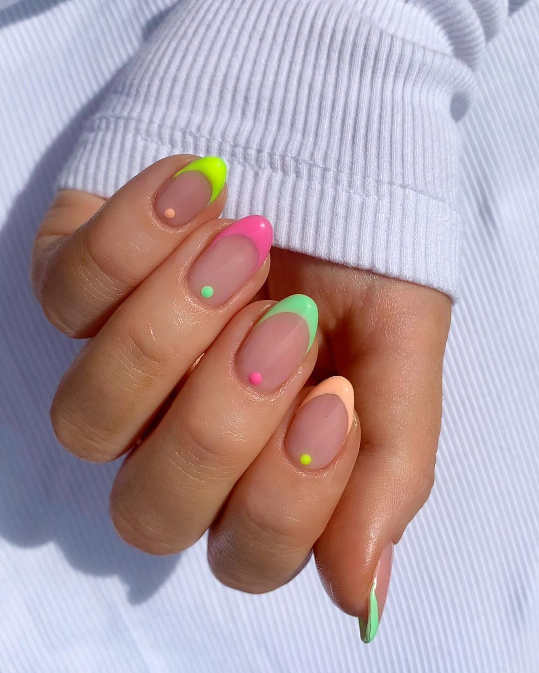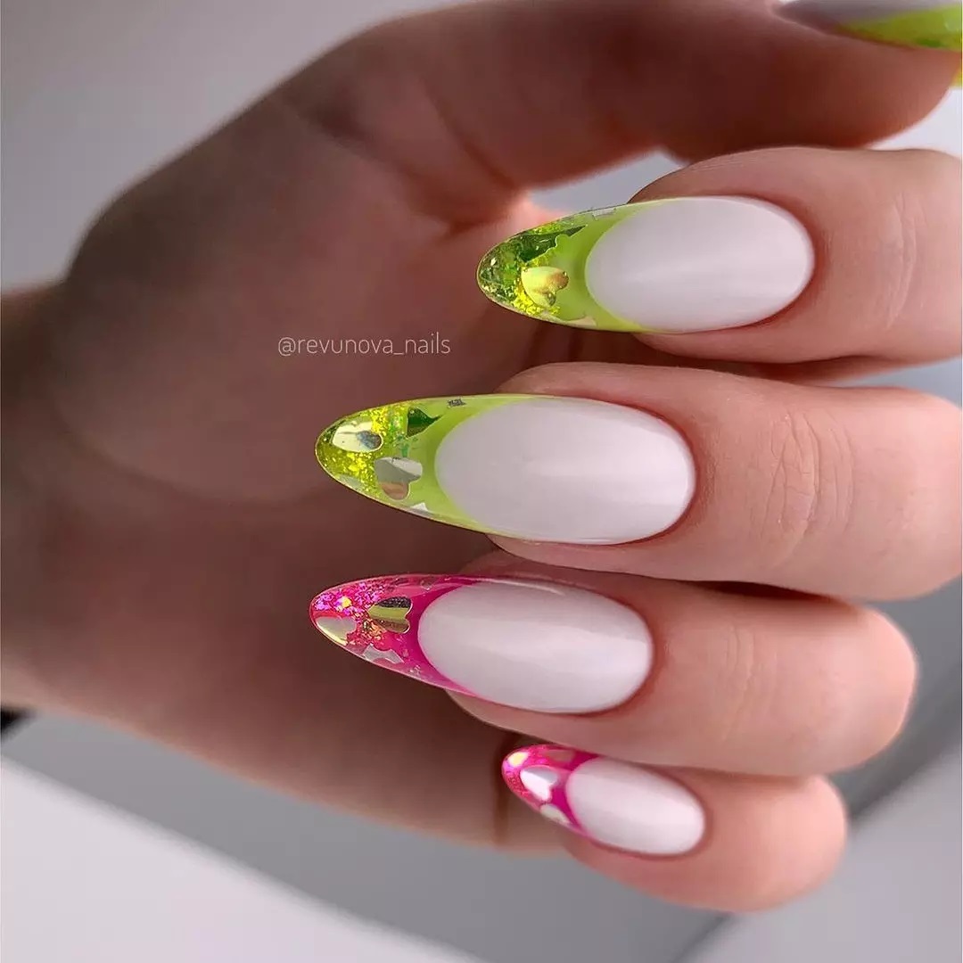 Очень красивым оформлением миндалевидных ногтей будет цветной френч. Разные яркие цвета делают классический френч ярче и заметнее. Причем такой дизайн можно делать не только привычной формы, но еще: