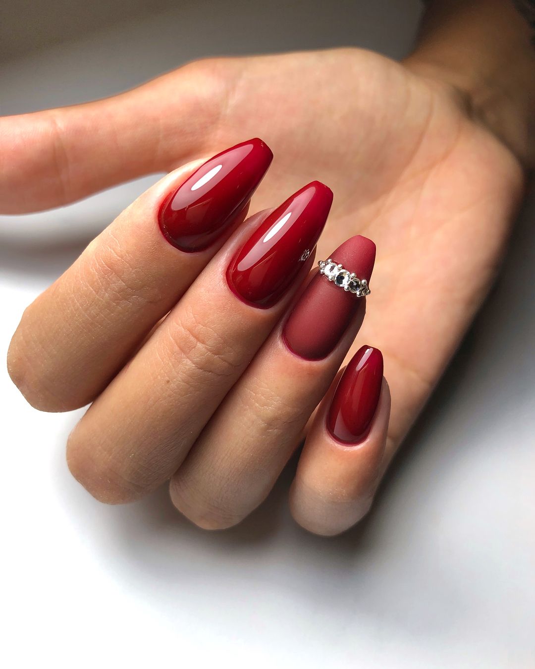 Стразами можно дополнить практически любой маникюр, придав ему особой роскоши и элегантности. Ими можно подчеркнуть готовый дизайн либо сделать центром композиции. Изумительно сочетается с матовым покрытием, перетягивая все взгляды на себя. Такой маникюр просто невозможно не заметить.