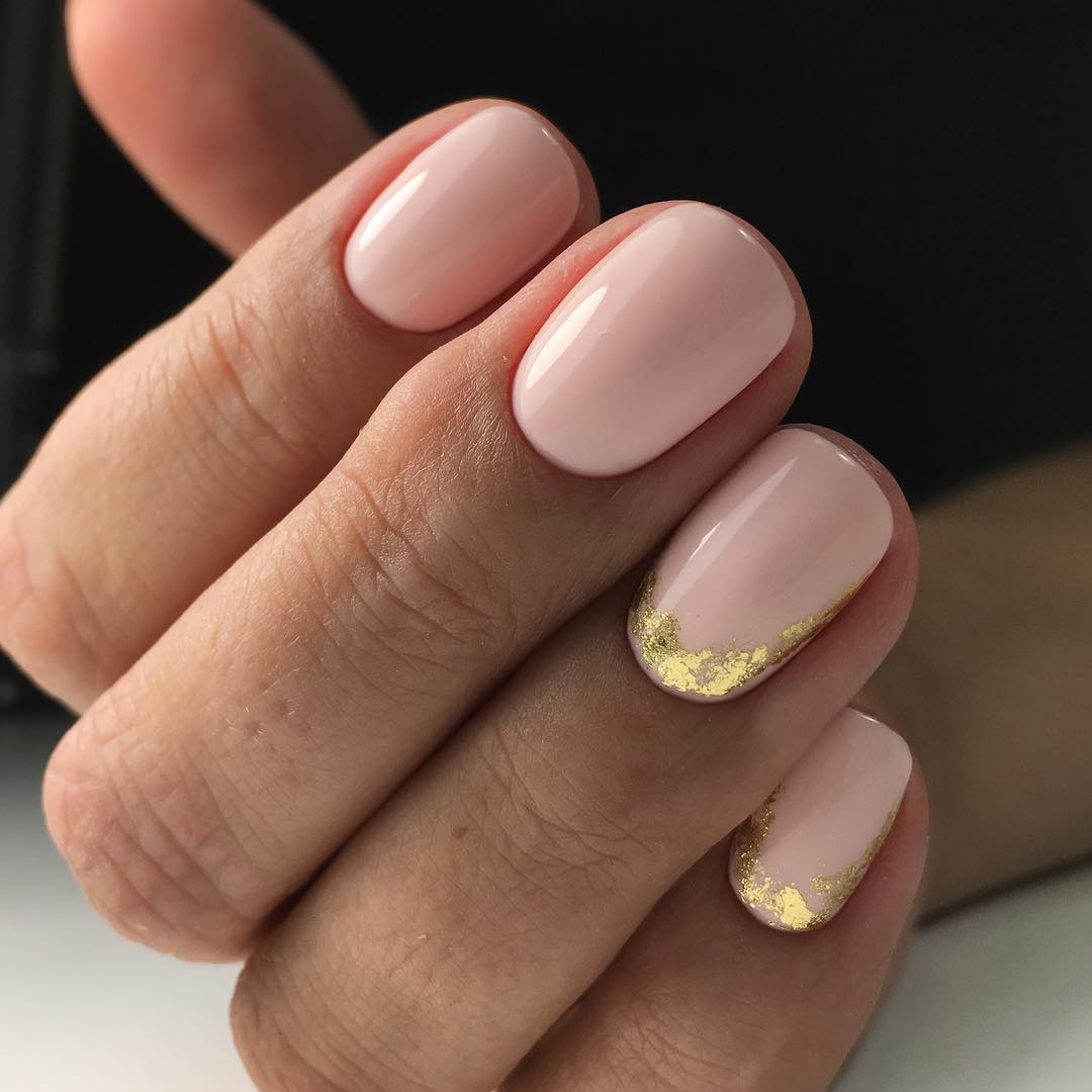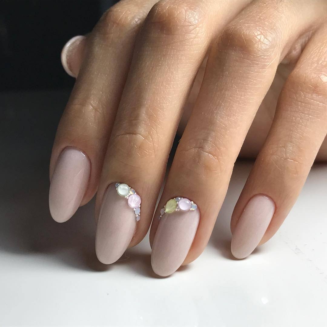 Если у вас нет времени и средств на салон красоты, вы можете смело сделать модный маникюр самостоятельно. Накрасьте ногти прозрачным или натурально-розовым лаком и украсьте два ногтя камешками у основания. Это не обязательно должны быть стразы. Вы можете просто поставить точку лаком и засыпать ее блестящей пылью.