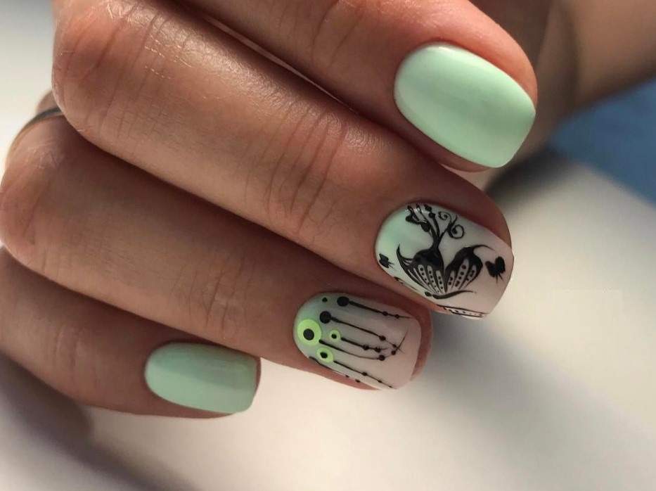 Ультрамодный образ можно создать при его сочетании с ярким цветом лайма. Глубокий насыщенный зеленый цвет с синим отливом красиво смотрится с бежевыми и белыми оттенками лаков.