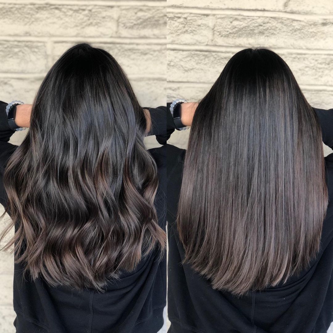 Для модного окрашивания волос в 2023 году на средние волосы для брюнеток стилисты тоже подготовили множество вариаций оттенков, которые будут крайне востребованы и популярны. Темные волосы довольно легко затемнить, можно попробовать оттенки какао и темного шоколада, темный с синеватым блеском.