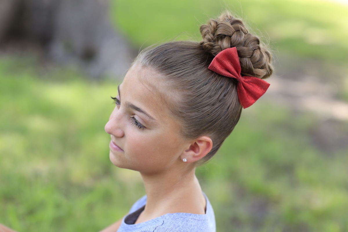 На первое сентября важным атрибутом являются банты. На длинных локонах они смотрятся особенно восхитительно. Сделайте шишку и закрепите ее невидимками, украсив белоснежным аксессуаром.