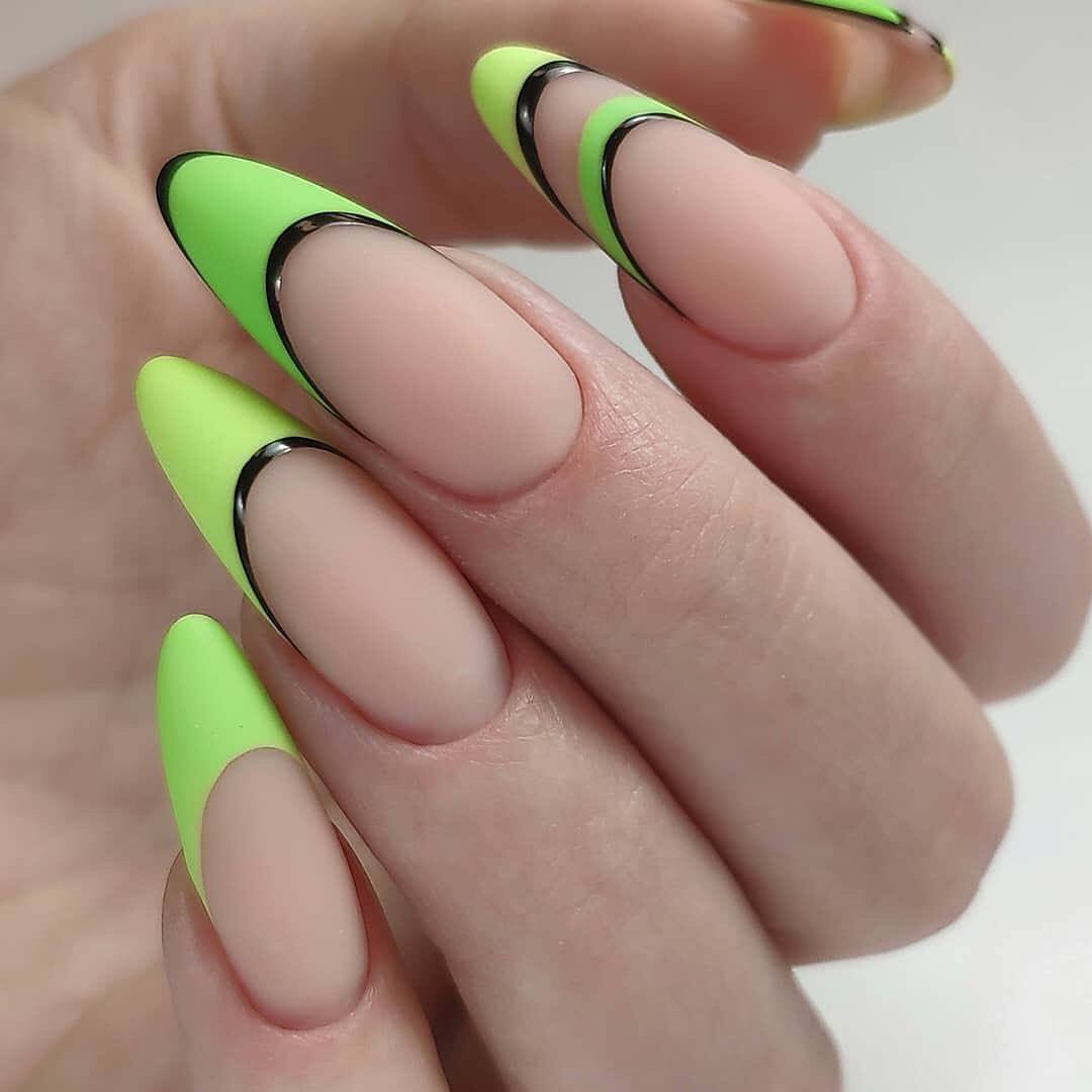 Мода последних сезонов в нейл арте — цветной французский маникюр. Улыбка может быть самых разных оттенков — ярких неоновых, черных, синих и зеленых. Ограничений нет. Еще один смелый вариант — сделать каемки на обеих руках разными. Для этой цели выбирают контрастные цвета лака или близкие.