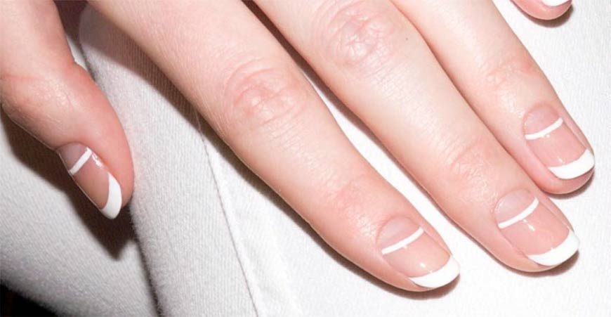 Такой дизайн потребует определенной сноровки или вспомогательных средств. Это может быть обычная клейкая лента для дизайна. Нанесите базовое покрытие, просушите. Теперь приложите ленту в изогнутом виде на воображаемую границу (туда, где бы у вас начинался белый кончик). Белым (или любым другим цветом) окрасьте весь ноготь, и удалите ленту. В итоге вы получите пустую линию.