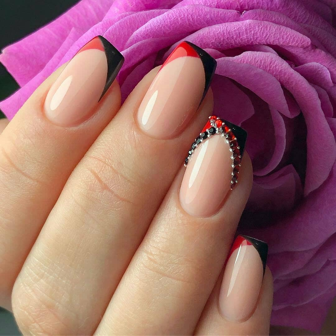 Овальную форму ногтей удачно обыграет черный акцент на кончиках. Он добавит маникюру контраста, а мягкая форма сохранит изящное впечатление от результата. Сочетание такого френча идеально подойдет для средней и короткой длины.