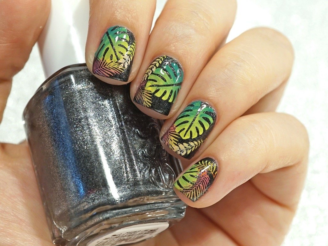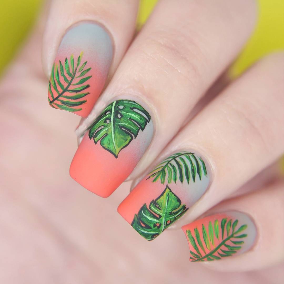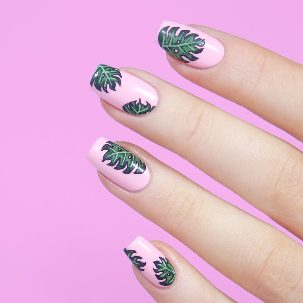 Настоящий хит лета – яркий тропический рисунок. Его используют буквально везде, начиная с оформления одежды, аксессуаров и заканчивая маникюром. Крупная зеленая листва смотрится особенно эффектно в сочетании с яркими оттенками лака. К примеру, на желтом или розовом покрытии. Также ее нередко сочетают с черно-белым оформлением ногтей. В качестве дополнения дизайна можно сделать изображение фруктов или же морских жителей.