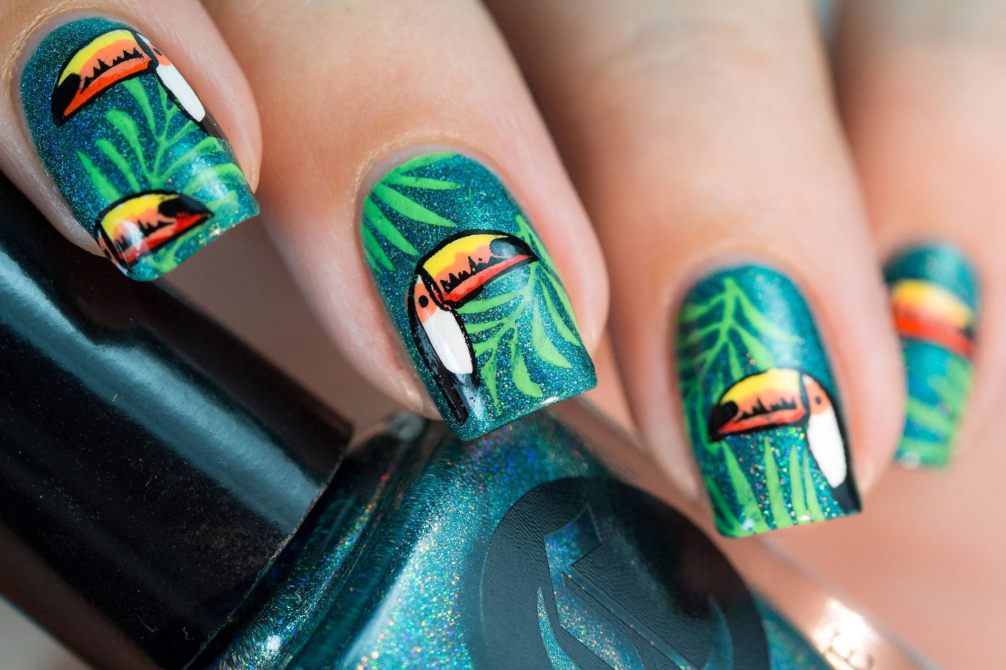 В сочетании с тропическим принтом отлично смотрится практически любой декор. Однако наиболее популярными стали стразы, блестки и втирка. Все это предает маникюру особой яркости в летнем сезоне.
