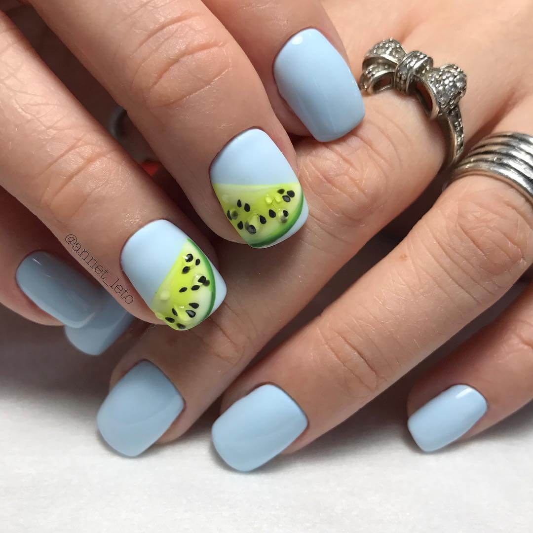 В летнем сезоне как никогда хочется экспериментировать, добавляя яркие детали хотя бы в дизайне ногтей. В этом году предлагаем вспомнить о рисунке в виде любимых фруктов и ягод. Только представьте, клубника, малина, бананы, арбуз или же киви могут стать украшением ваших ногтей. Такой маникюр всегда смотрится сочно и свежо.